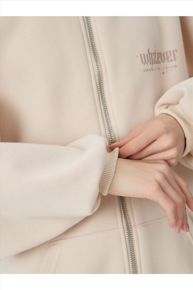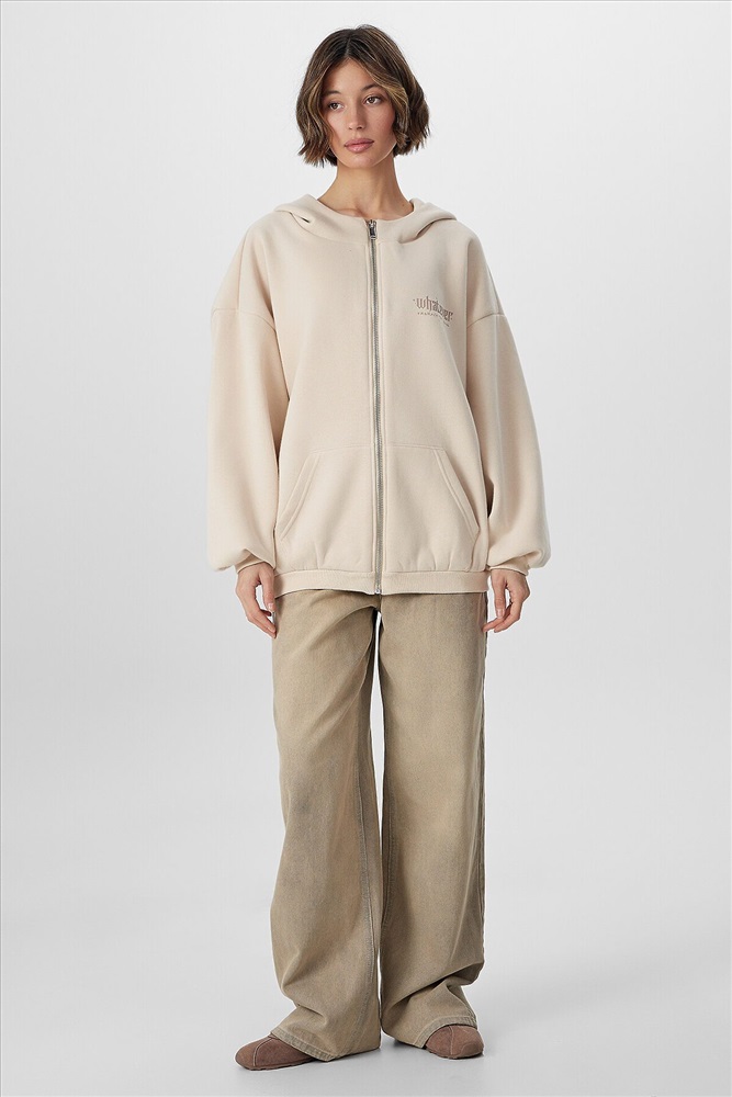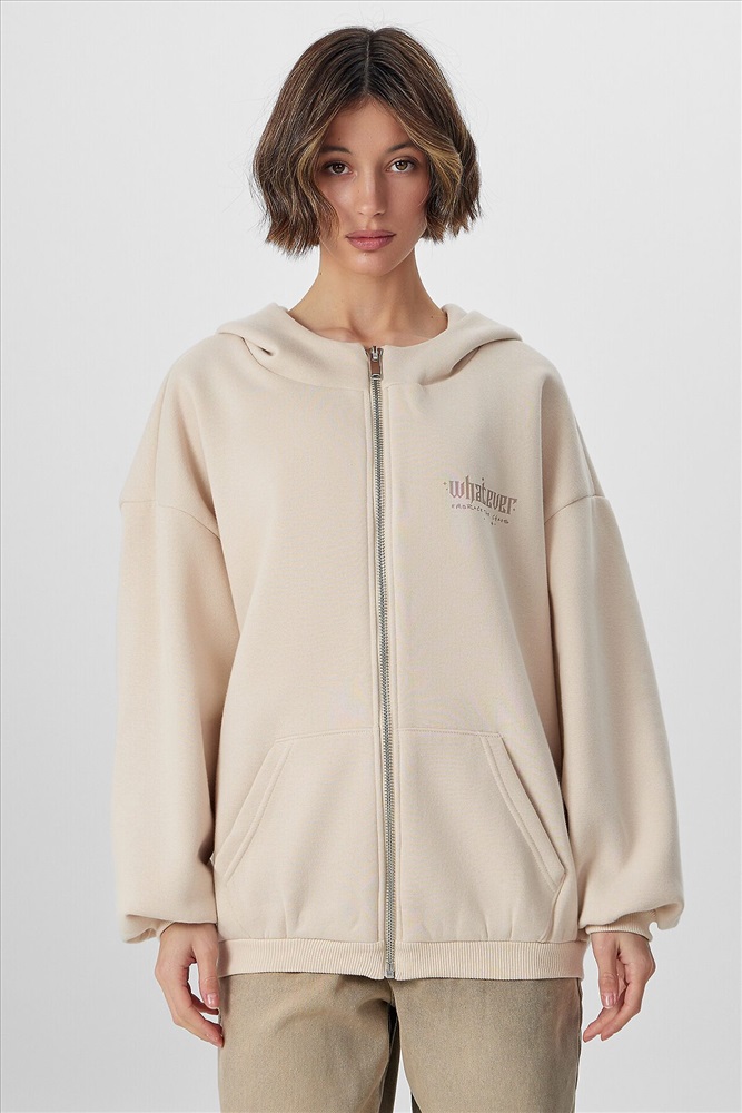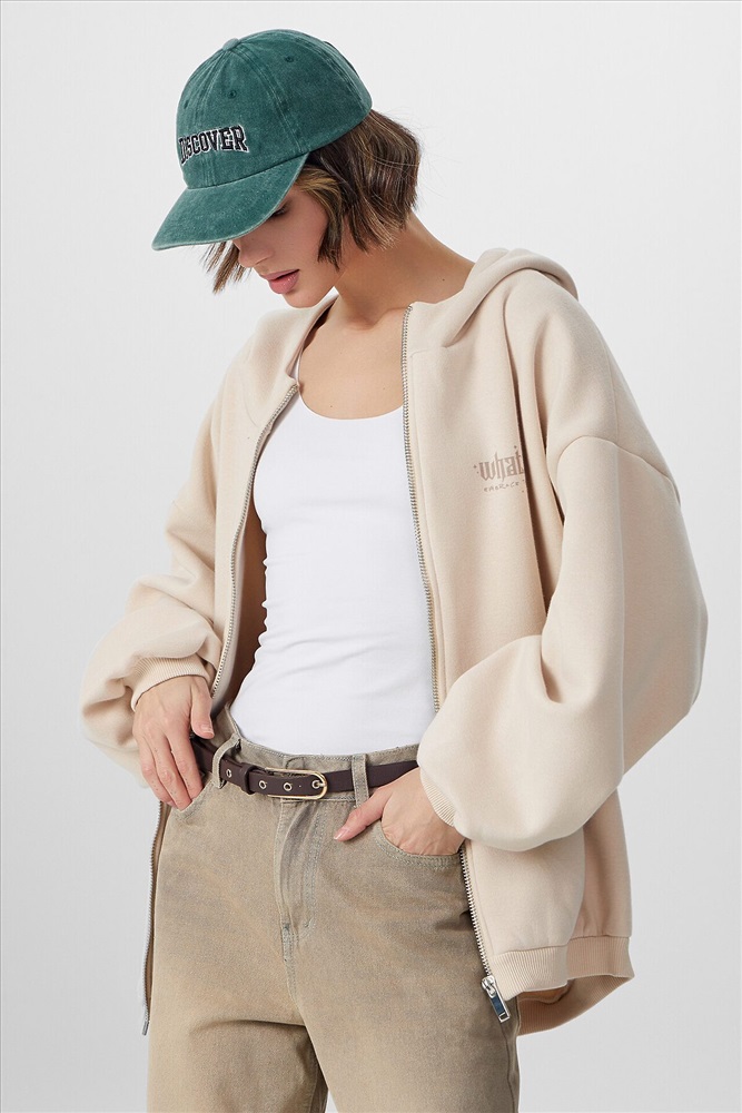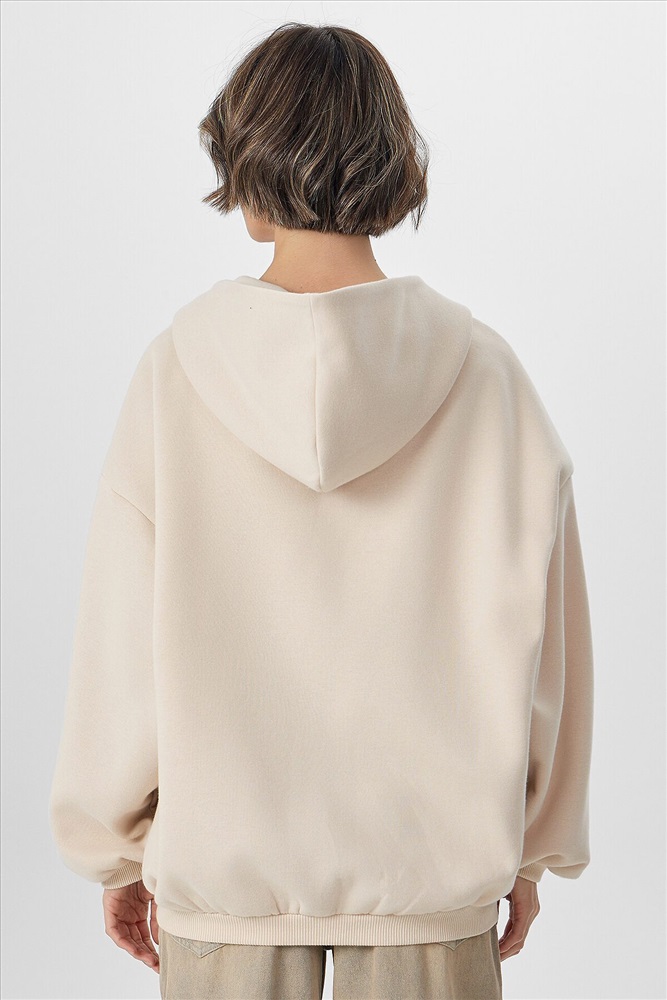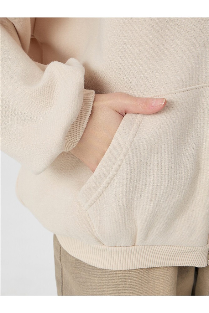 BASIC + Толстовка свободная, оверсайз. Горловина округлой формы с капюшоном. Шов втачивания капюшона по горловине спинки закрыт тесьмой (хб 10мм). Рукав втачной, длинный с отрезными манжетами из рибаны. Линия плеча спущена. По переду накладной карман. Центральная застежка на молнию (OpenEnd, StandartMetal №8 (7.6мм), слайдер Auto-Lock). По низу толстовки отрезной пояс из рибаны. + навесной ярлык BASIC +