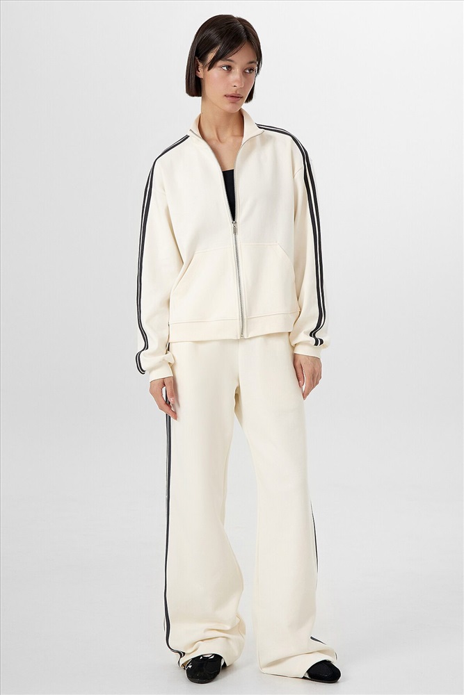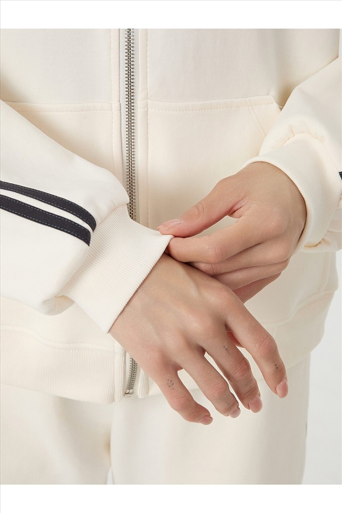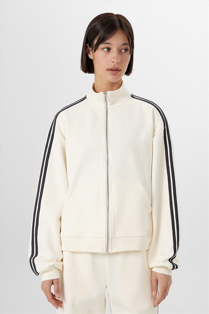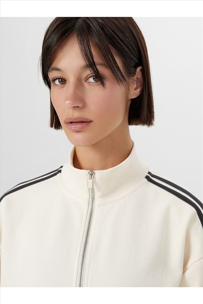 Модель отличается продуманными деталями: удобный воротник-стойка из эластичной рибаны мягко облегает шею, не натирая кожу. Длинные рукава заканчиваются манжетами из той же рибаны, обеспечивая комфортную посадку. Яркие лампасы из кулирки проходят по всей длине рукава, переходя на плечо, добавляя образу спортивный шик.