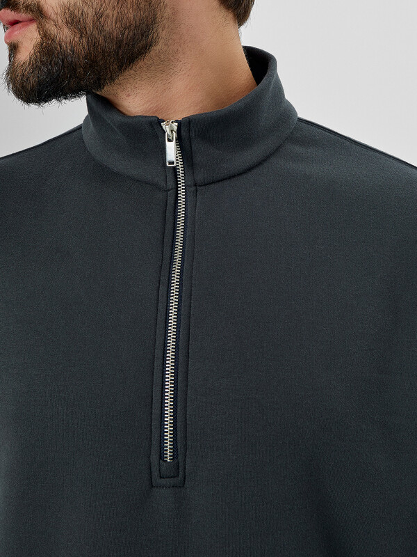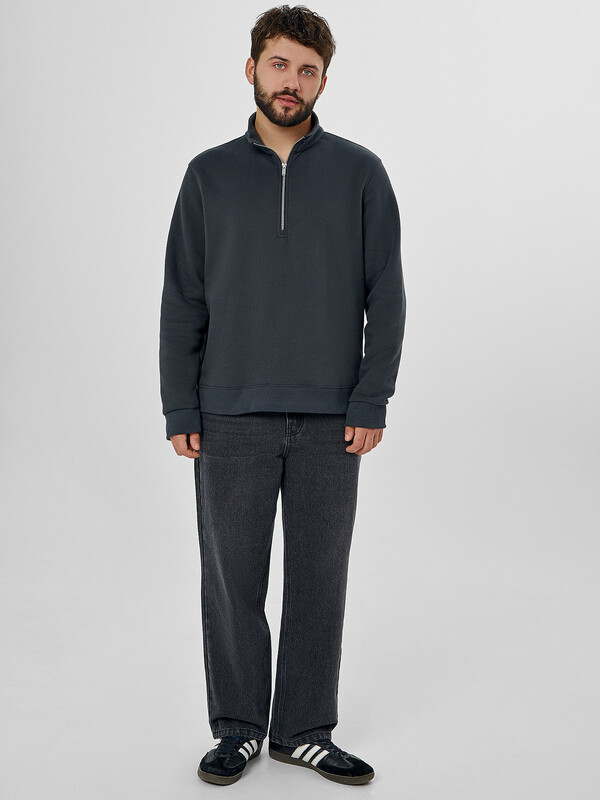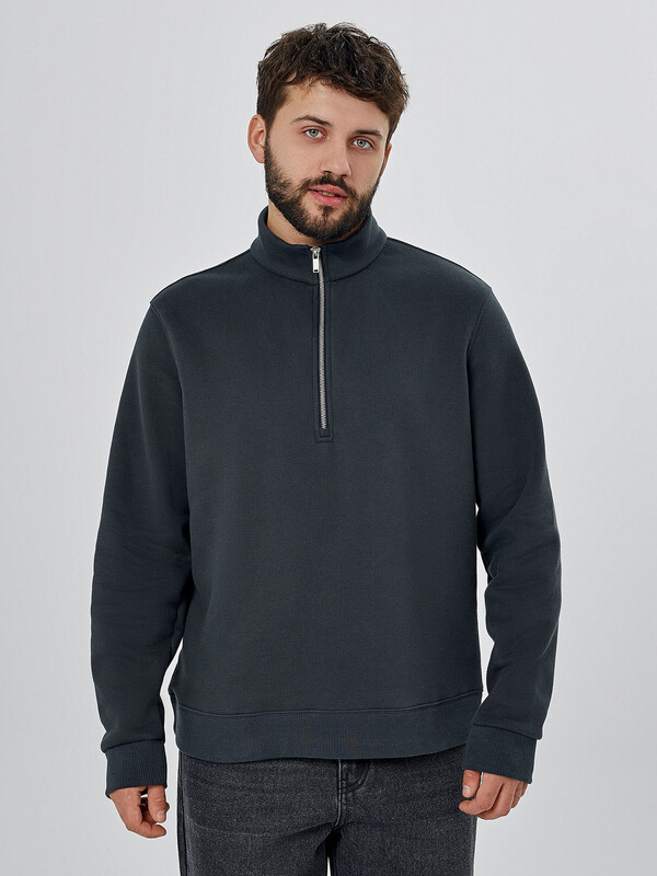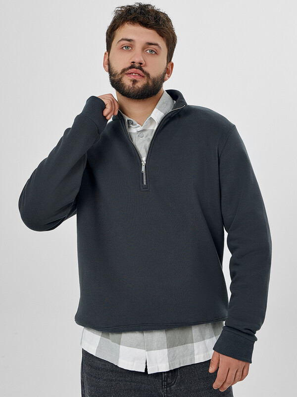 Толстовка свободная, прямая. Горловина округлой формы с воротником стойкой из основного полотна. Рукава втачные длинные. Линия плеча слегка спущена. По окату рукава и плечевым швам отделочные строчки. По низу рукава отрезная манжета из рибаны. Центральная застежка на тесьму-молнию. По низу изделия отрезной пояс из рибаны. По шву втачивая пояса - отделочные строчки. 65% хлопок; 35% полиэстер Комментарии к товару