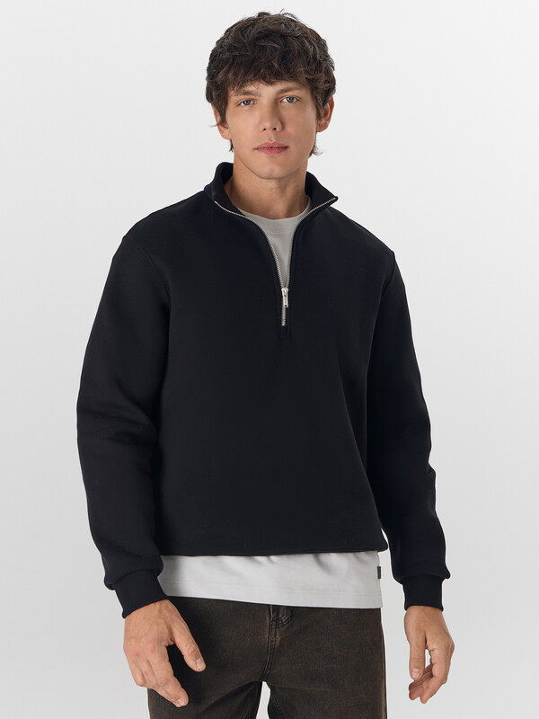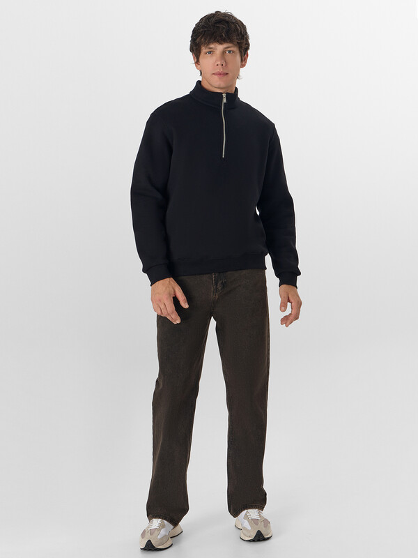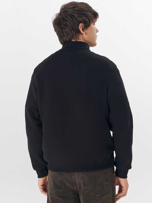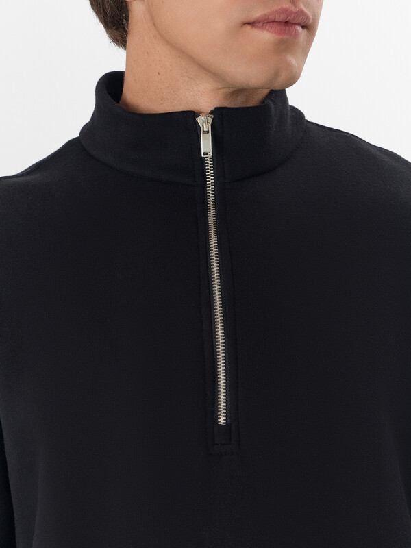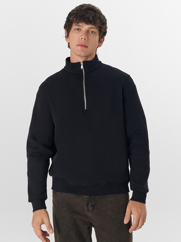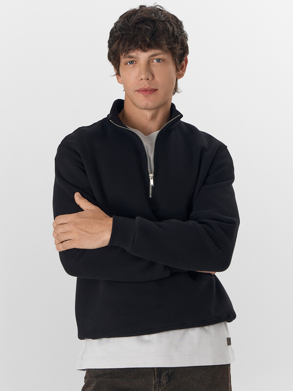 Толстовка свободная, прямая. Горловина округлой формы с воротником стойкой из основного полотна. Рукава втачные длинные. Линия плеча слегка спущена. По окату рукава и плечевым швам отделочные строчки. По низу рукава отрезная манжета из рибаны. Центральная застежка на тесьму-молнию. По низу изделия отрезной пояс из рибаны. По шву втачивая пояса - отделочные строчки. 65% хлопок; 35% полиэстер Комментарии к товару
