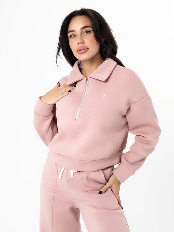 Женская толстовка с застежкой на короткую молнию и спущенной линией плеча. Модель выполнена из футера с начесом. Лаконичный дизайн дополнен стильной вышивкой с левой стороны. Манжеты рукавов и низ изделия оформлены планкой из основного полотна для аккуратного силуэта. Удобная и современная модель для повседневной носки.