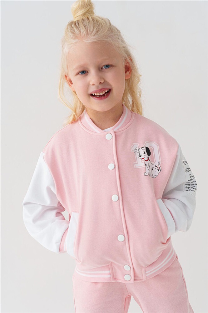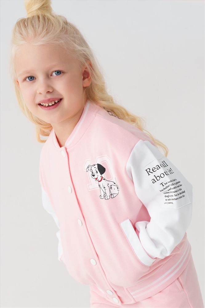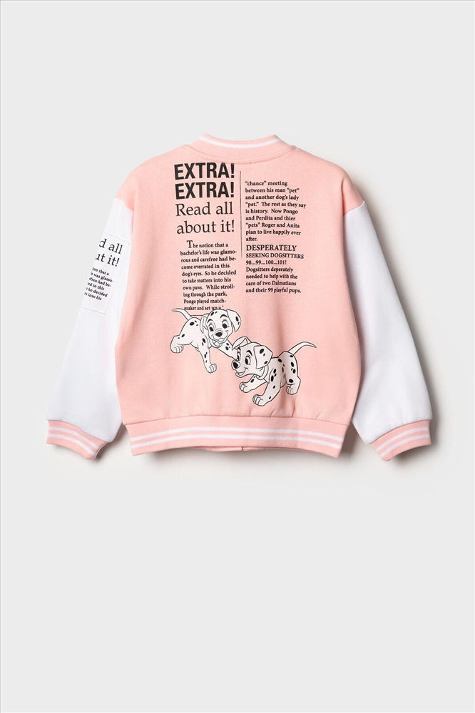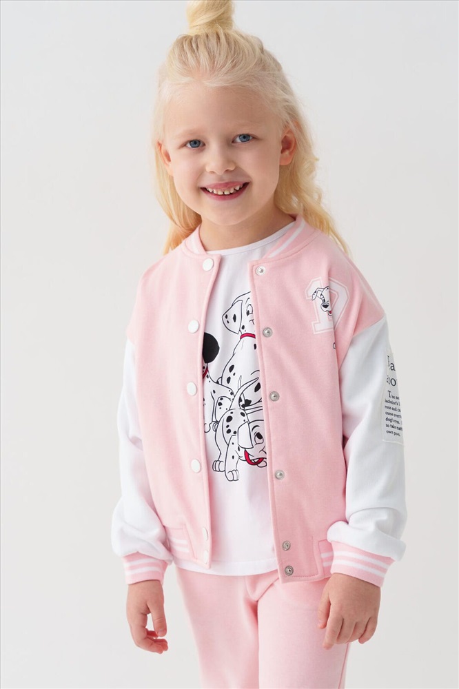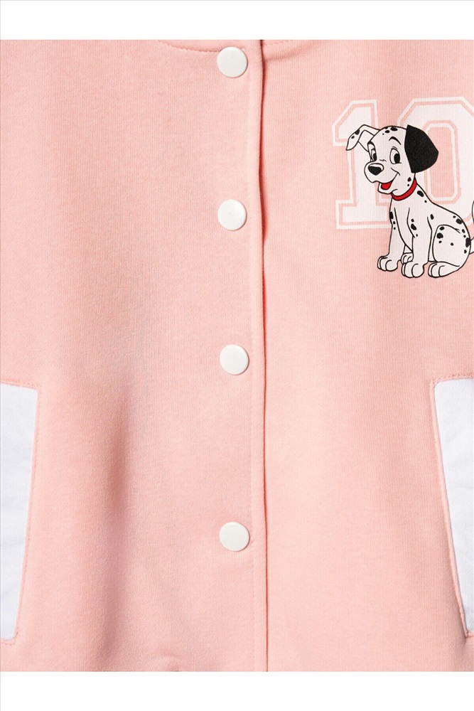 Детская толстовка-бомбер на кнопках для девочки. Выполнена из хлопкового футера без начеса. На груди — выразительный принт с любимым мультяшным персонажем "101 далматинец". На плече - нашивка. Спереди два кармана. Низ изделия и рукава оформлены эластичными резинками.
