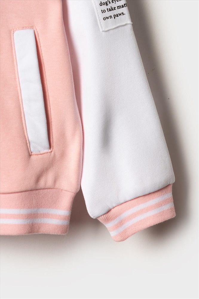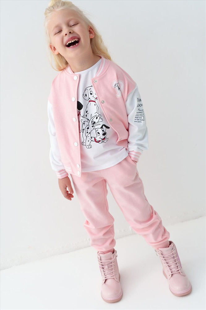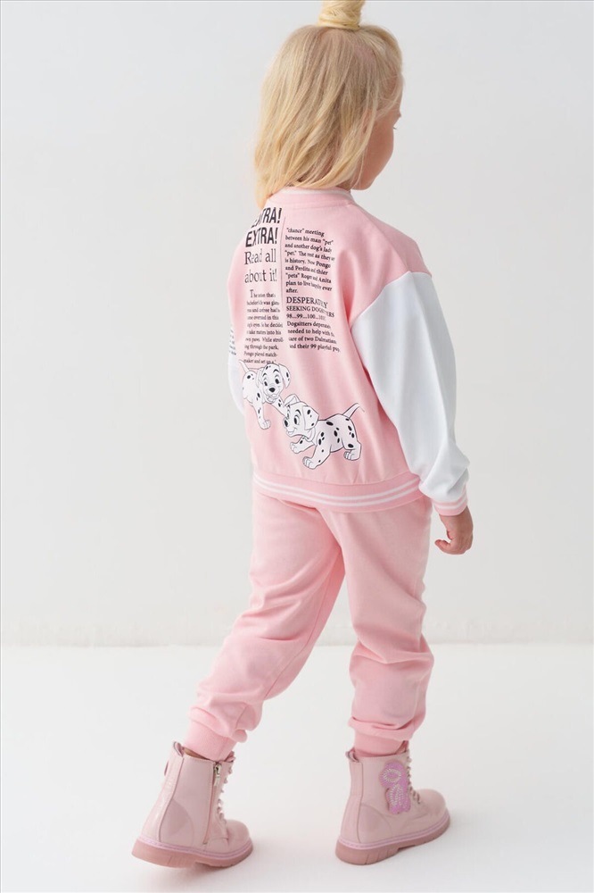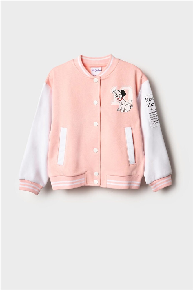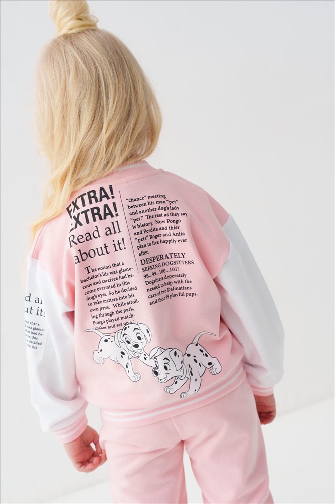 Детская толстовка-бомбер на кнопках для девочки. Выполнена из хлопкового футера без начеса. На груди — выразительный принт с любимым мультяшным персонажем "101 далматинец". На плече - нашивка. Спереди два кармана. Низ изделия и рукава оформлены эластичными резинками.