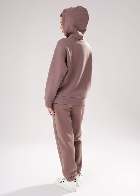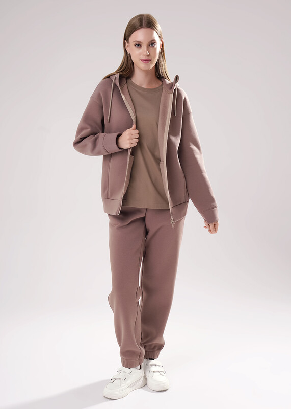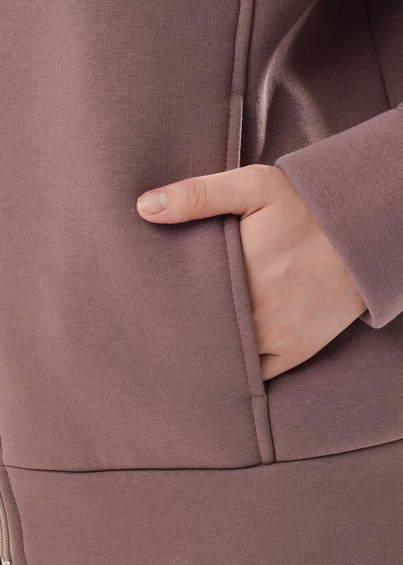 Куртка спортивная из трикотажного полотна футер с начесом, свободного кроя на молнии с капюшоном на подкладе и шнуром. Длинный рукав со спущенной линией плеча. По переду резы с карманами в швах. По низу рукава и изделия манжет. Спереди принт.