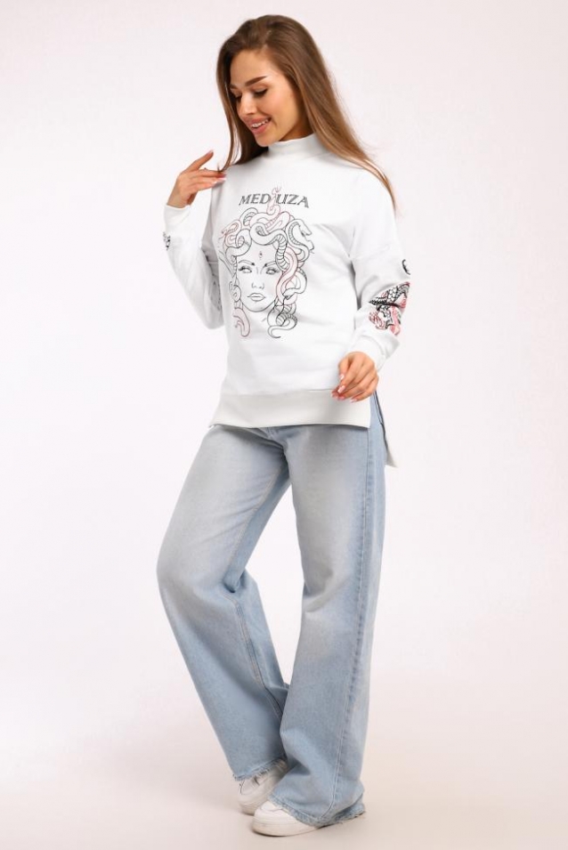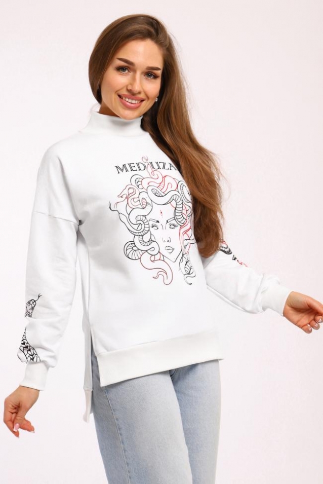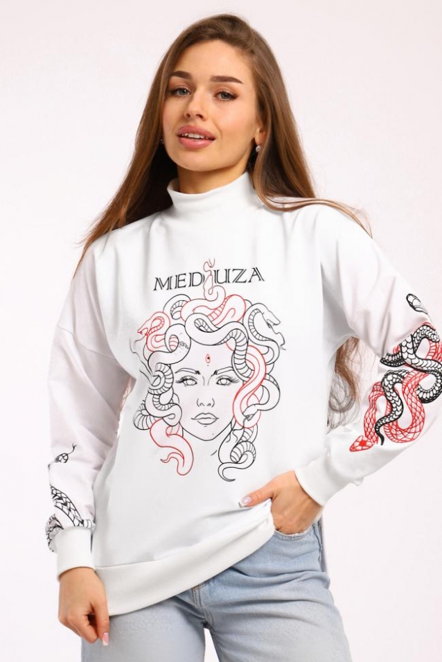 Толстовка с принтом KEM это стильное и комфортное решение для повседневного образа. Модель выполнена из мягкой и приятной к телу ткани, состоящей из 71% хлопка, 24% полиэстера и 5% лайкры, что обеспечивает свободу движений и удобство в носке. Оригинальный принт медуза на толстовке добавляет индивидуальности и яркости вашему стилю. Благодаря разрезам по бокам толстовка прекрасно садится на фигуру, подчеркивая ее достоинства. Модель без капюшона и застежки, что делает ее еще более удобной для носки.