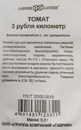 Ранний сорт для временных пленочных укрытий, универсального назначения. Растение индетерминантное (высокорослое), плоды плоскоокруглые, гладкие, выравненные, красные, массой 95-110 г. Отличного вкуса. На рассаду высевают в марте-апреле. На постоянное место высаживают в мае-июне. Ценность сорта: высокая урожайность, дружная отдача, отличный вкус, транспортабельность. Товарная урожайность 27,8- 30,1 кг/кв.м. Фасовка 0,3г Комментарии к товару
