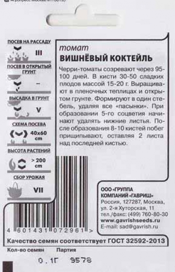 Черри-томаты очень популярны. Это — самые сладкие плоды с незабываемым десертным вкусом, лучшее украшение фуршетных и праздничных столов, легкие и быстрые десерты, лакомство для детей и взрослых прямо с растения, вкусные консервированные ассорти. Растения высокорослые (более 200 см). Плоды созревают очень рано, уже через 95-100 дней после появления всходов. Выращивают в пленочных теплицах и открытом грунте (с подвязкой к кольям в 2-3 стебля). Кисти с 30-50 плодами. Плоды блестящие, словно лакированные, массой 15-20 г. Посев на рассаду в марте. Пикировка — в фазе первого настоящего листа. Высадка в теплицы в мае. Формируют в один стебель, удаляя все «пасынки». При образовании 5-го соцветия начинают удалять нижние листья. После образования 8-10 кистей побег прищипывают, оставляя 2 листа над последней кистью. Урожайность одного растения до 2,0 кг.
