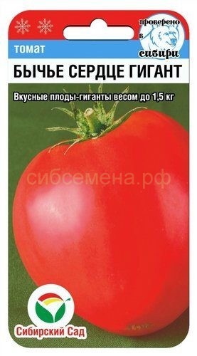 Среднеспелый сорт-гигант для защищенного грунта. Прекрасно подходит для садоводов, предпочитающих выращивать в теплицах крупноплодные сорта томатов. Растение индетерминантное, мощное, высотой 1,5-2,0 м, что позволяет полностью использовать объем теплицы. Плоды любимой всеми сердцевидной формы, красные, мясистые, великолепного вкуса. Впечатляет размер плодов – от 400-600 гр до 1,5 кг, причем, чем лучше уход за растением, тем крупнее плоды и обильнее урожай. Посев на рассаду производят за 50-60 дней до высадки растений на постоянное место. Оптимальная постоянная температура прорастания семян 23-25 град. При высадке в грунт на 1 кв. м. размещают 3 растения. Выращивается в 2 стебля с подвязкой и пасынкованием