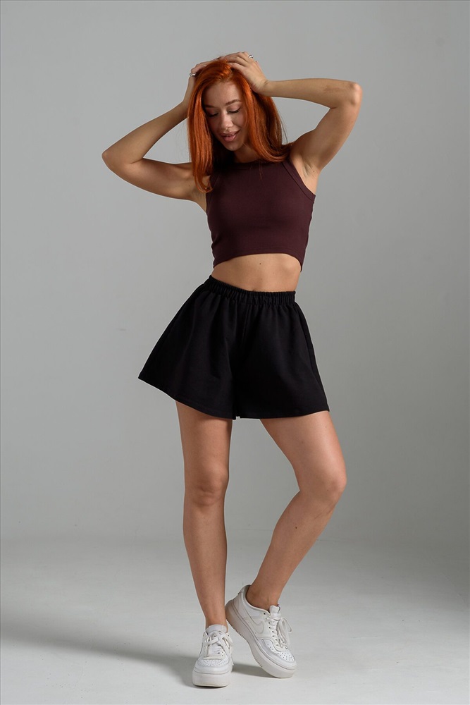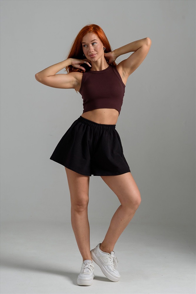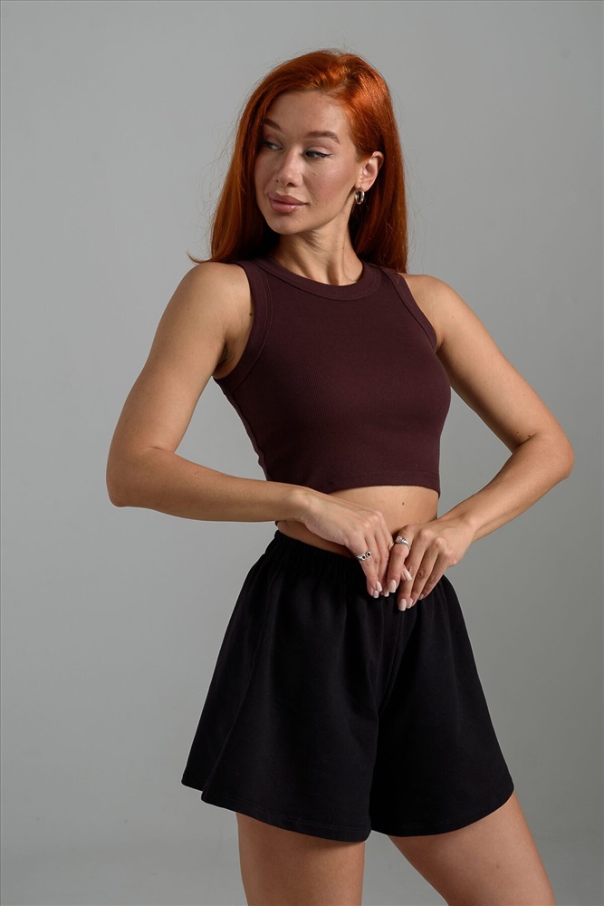 Базовый хлопковый топ укороченной длины. Выполнен из фактурной ткани в рубчик с добавлением лайкры, благодаря этому топ после стирки возвращается в прежнюю форму. Облегающий крой отлично садится по фигуре, подчеркивая её достоинства. Круглая горловина, широкие бретели, не просвечивает, топ максимально комфортный в носке.