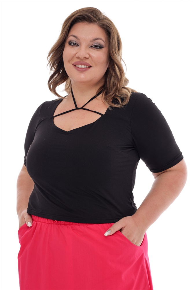 Укороченный топ облегающего кроя из мягкого трикотажа имеет короткие рукава. Фигурный вырез декорирован завязкой, которую можно оригинально завязать на груди. Кокетка и вытачки на груди обеспечивают оптимальную посадку по фигуре. Комбинировать топ такого плана можно с любимыми джинсами, брюками, юбками и шортами, создавая стильные аутфиты, в которых Вам будет максимально комфортно.