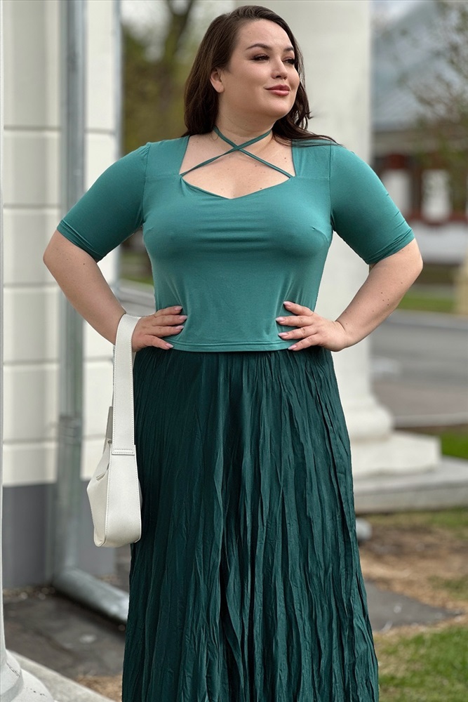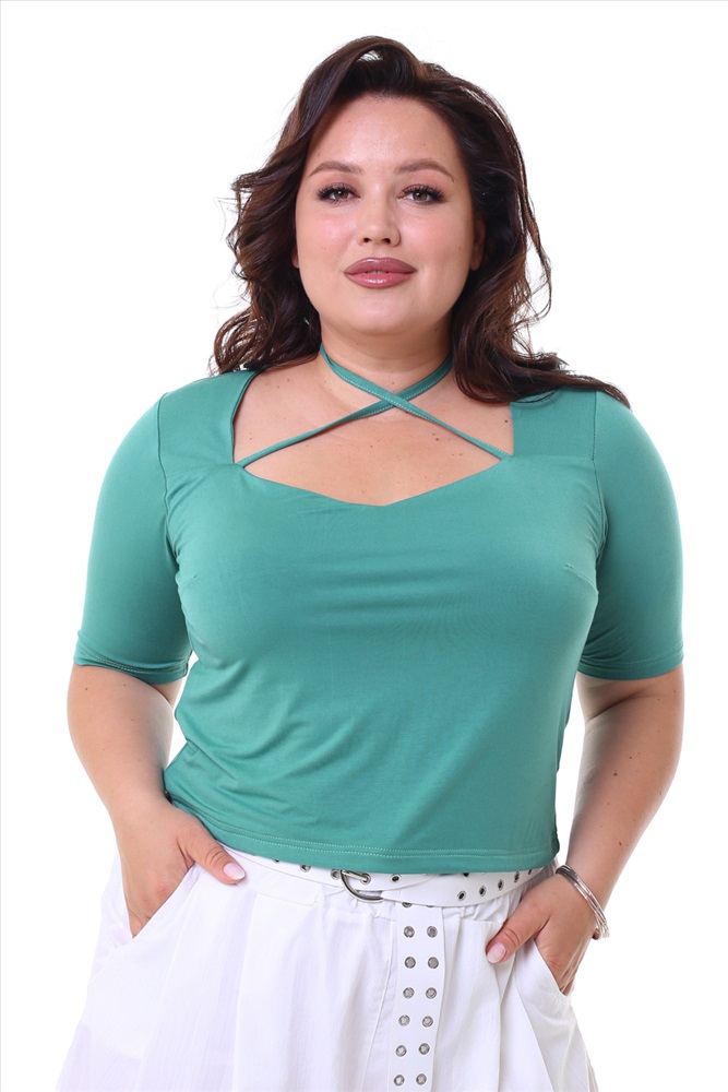 Укороченный топ облегающего кроя из мягкого трикотажа имеет короткие рукава. Фигурный вырез декорирован завязкой, которую можно оригинально завязать на груди. Кокетка и вытачки на груди обеспечивают оптимальную посадку по фигуре. Комбинировать топ такого плана можно с любимыми джинсами, брюками, юбками и шортами, создавая стильные аутфиты, в которых Вам будет максимально комфортно.