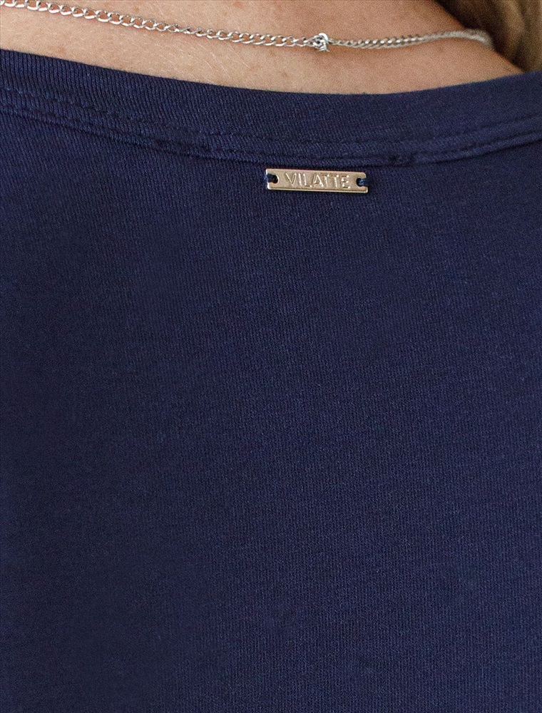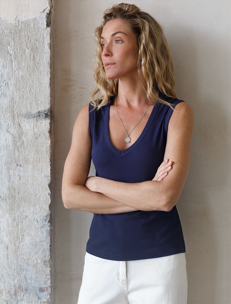 Топ выполнен из премиального хлопка с эластаном. V- вырез подчеркивает линию декольте и визуально вытягивает шею. Лаконичная базовая модель впишется в любой гардероб и дополнит многослойные образы. Материал изделия хорошо тянется и гарантирует идеальную посадку по фигуре. Топ украшен металлическим логотипом бренда.