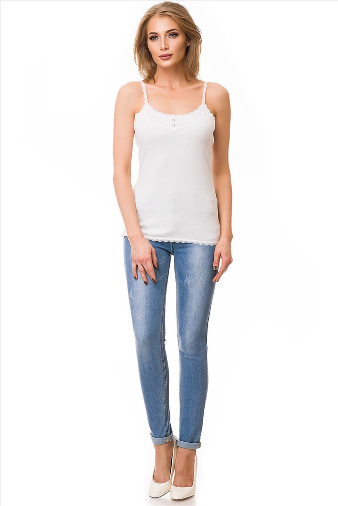 Страна производства: Турция Базовый топ на тонких бретелях, выполненный из приятной к телу эластичной ткани. Модель облегающего кроя, с круглым вырезом горловины, с кантом из кружева. Очень комфортная модель для повседневной носки.