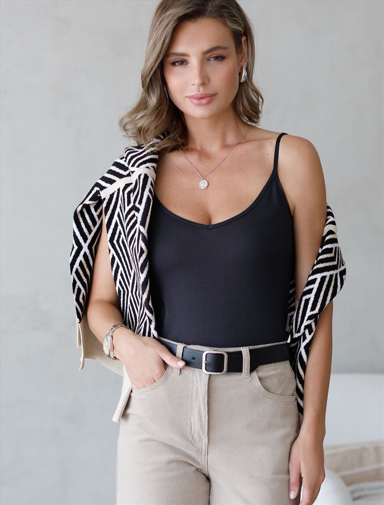 Состав: 92%Хлопок 8%ПУ; Плотность: 140 Г/м2; Параметры модели на первом фото: Рост 170, бюст 89, талия 63, бедра 92; Размер товара на первом фото: 42 Топ с V-вырезом выполнен из премиального хлопка. Модель дополнена регулируемыми бретелями, позволяющими носить изделие на нужном уровне. Эластичный материал гарантирует комфорт и формоустойчивость. Из украшений металлический логотип бренда.