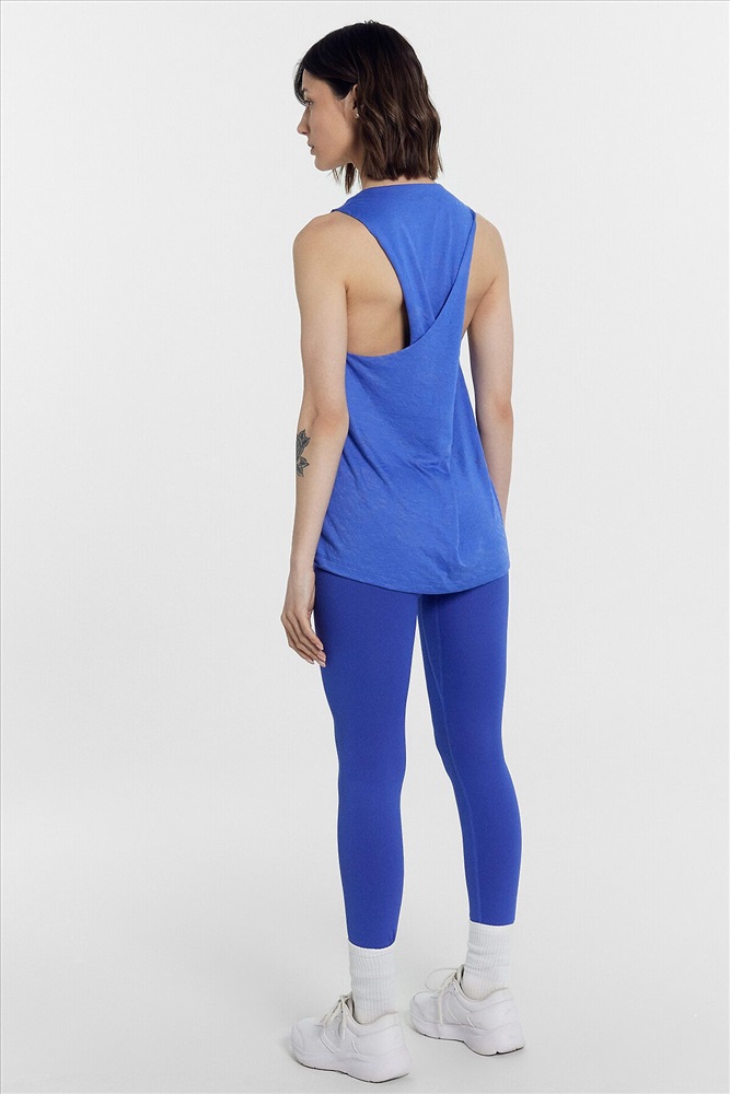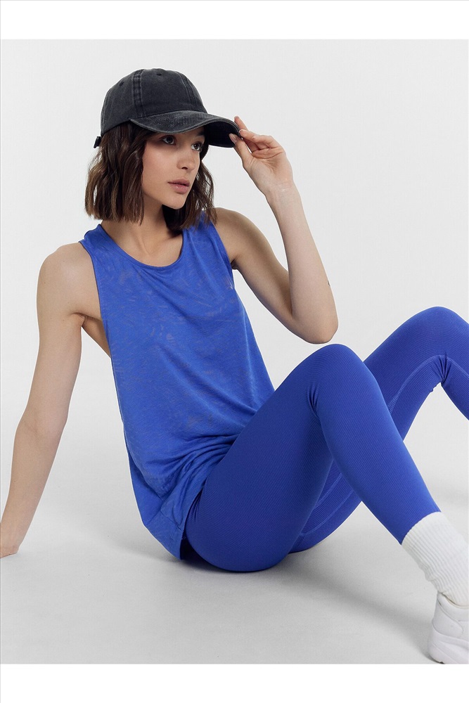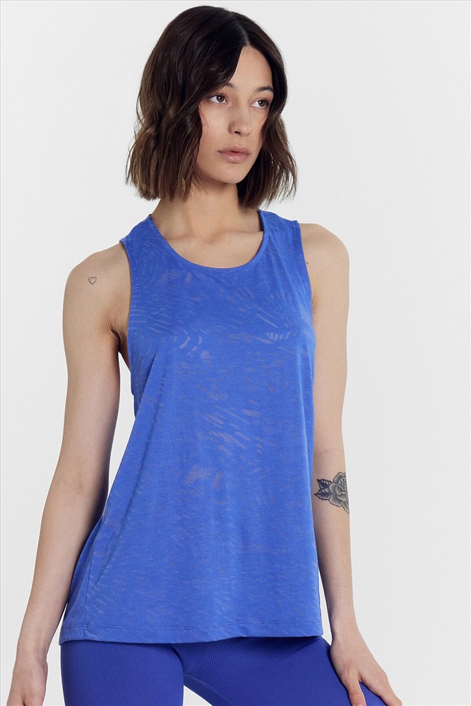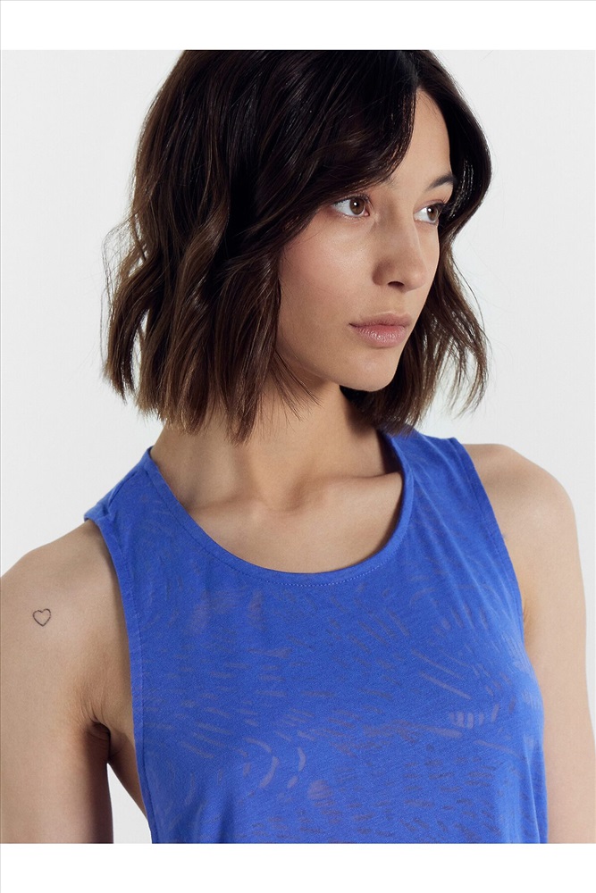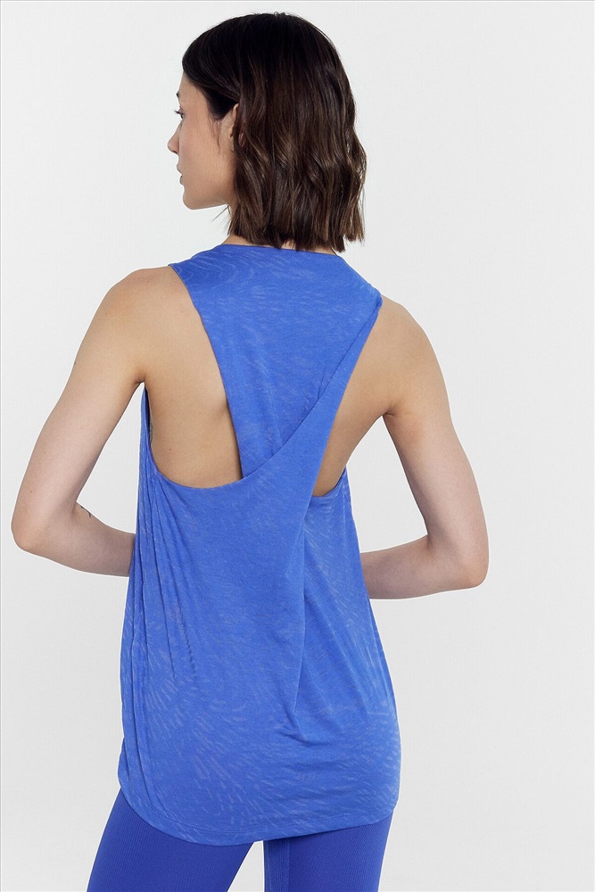 Топ изготовлен из трикотажного полотна кулирки. Топ прямой, длиной до линии бедер. Горловина округлой формы. Горловина переда и проймы окантованы бейкой и застрочена в чистый край. Деталь спинки перекручена. Нижний срез топа обработан швом вподгибку.