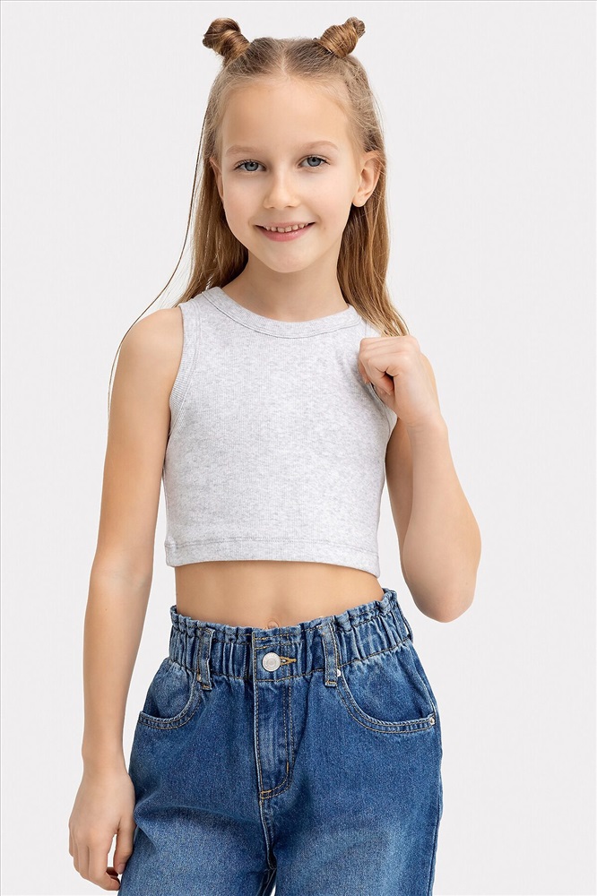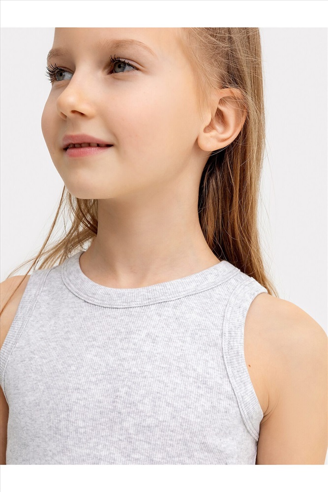 Топ для девочек прилегающего силуэта. Горловина круглая. Проймы и горловина окантованы бейкой из основного полотна. Низ изделия обработан швом в подгибку.
