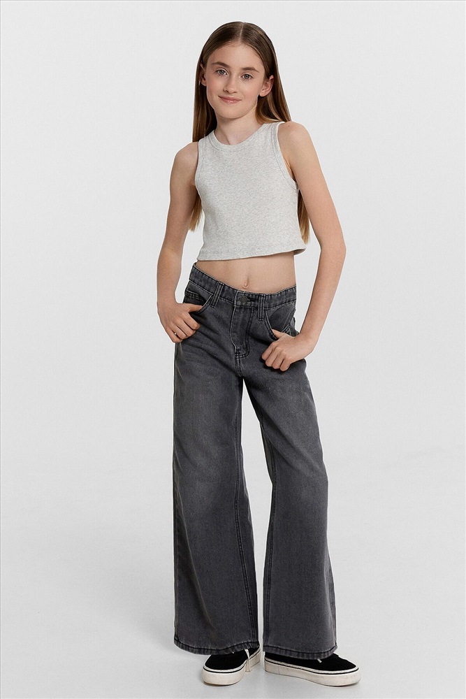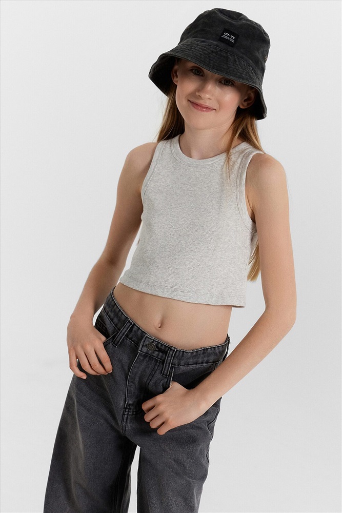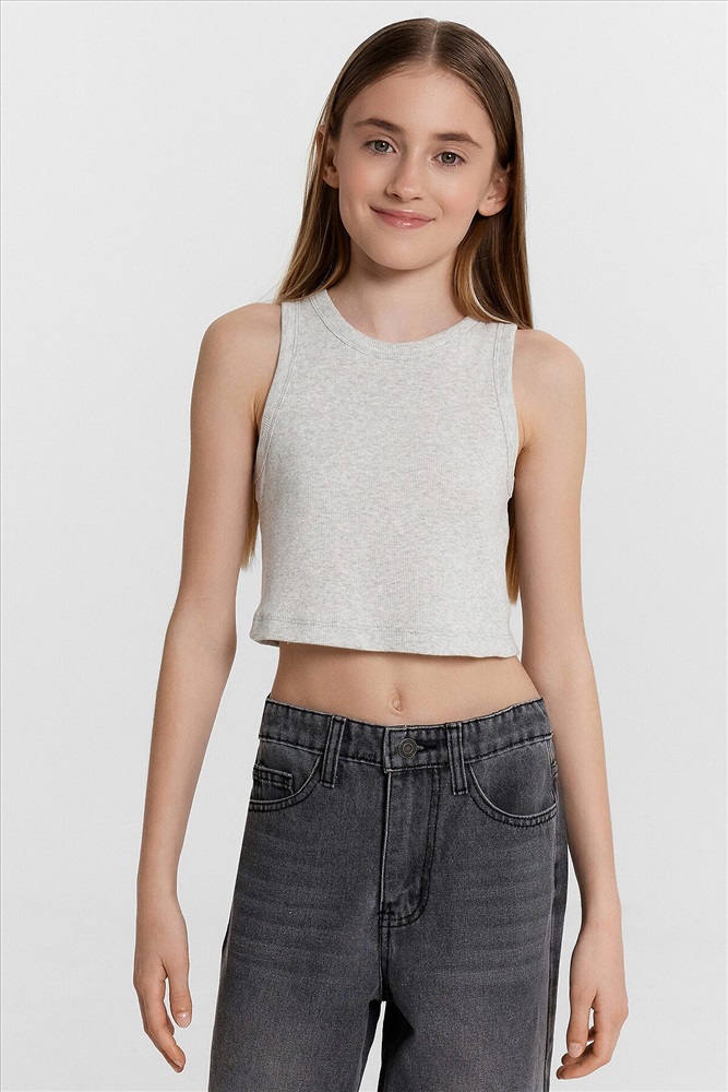 Топ для девочек прилегающего силуэта. Горловина круглая. Проймы и горловина окантованы бейкой из основного полотна. Низ изделия обработан швом в подгибку.