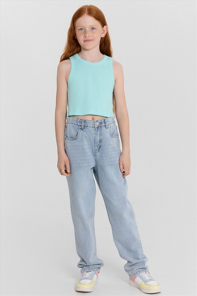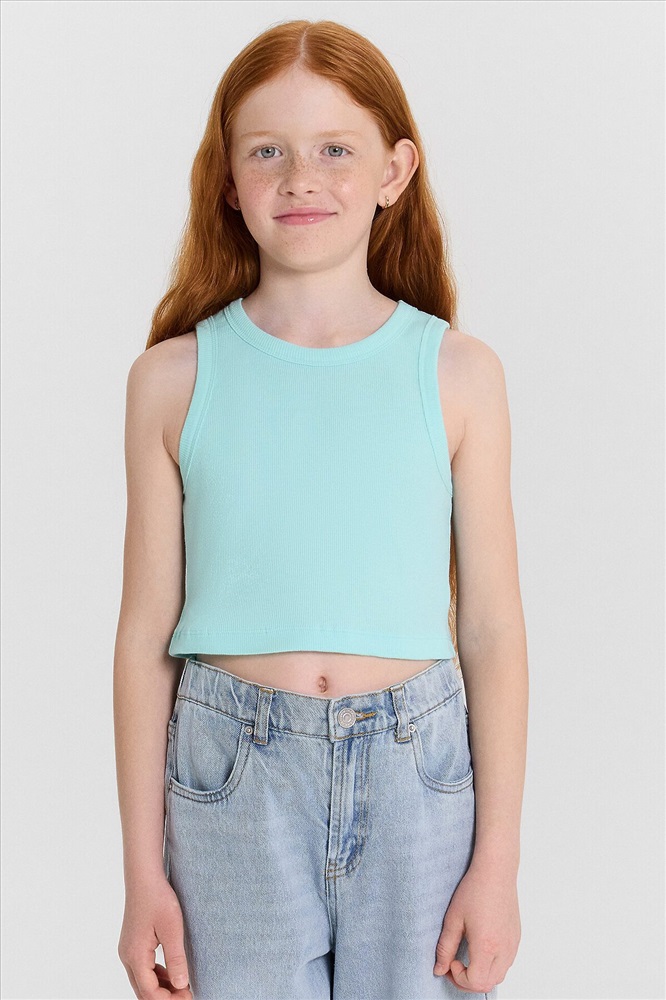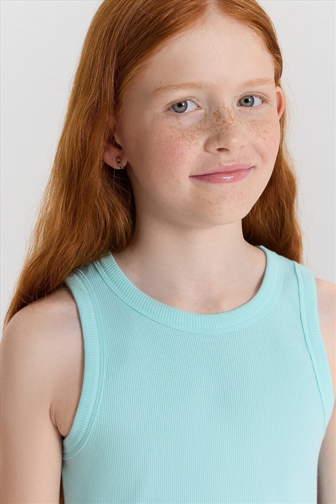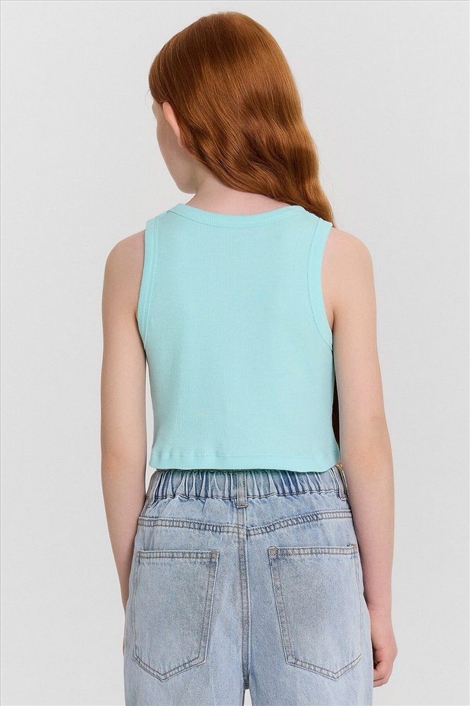 Топ для девочек прилегающего силуэта. Горловина круглая. Проймы и горловина окантованы бейкой из основного полотна. Низ изделия обработан швом в подгибку.