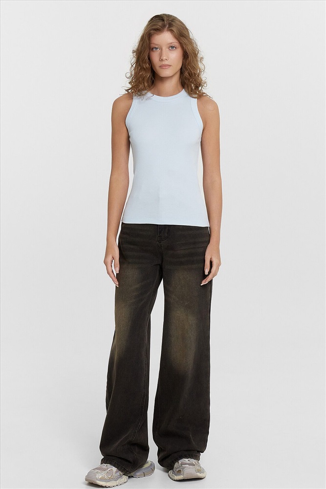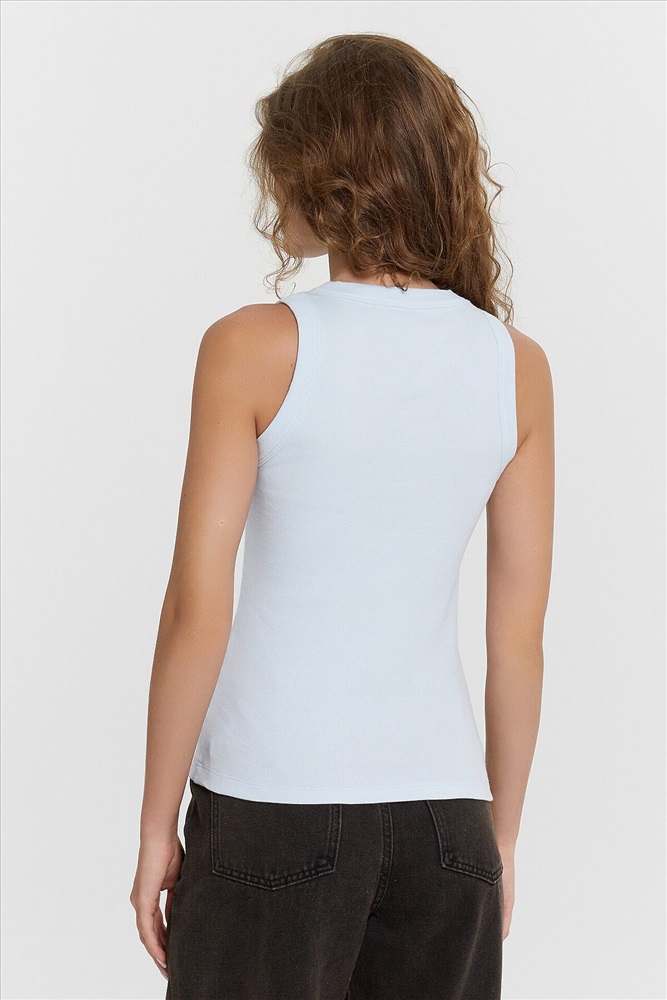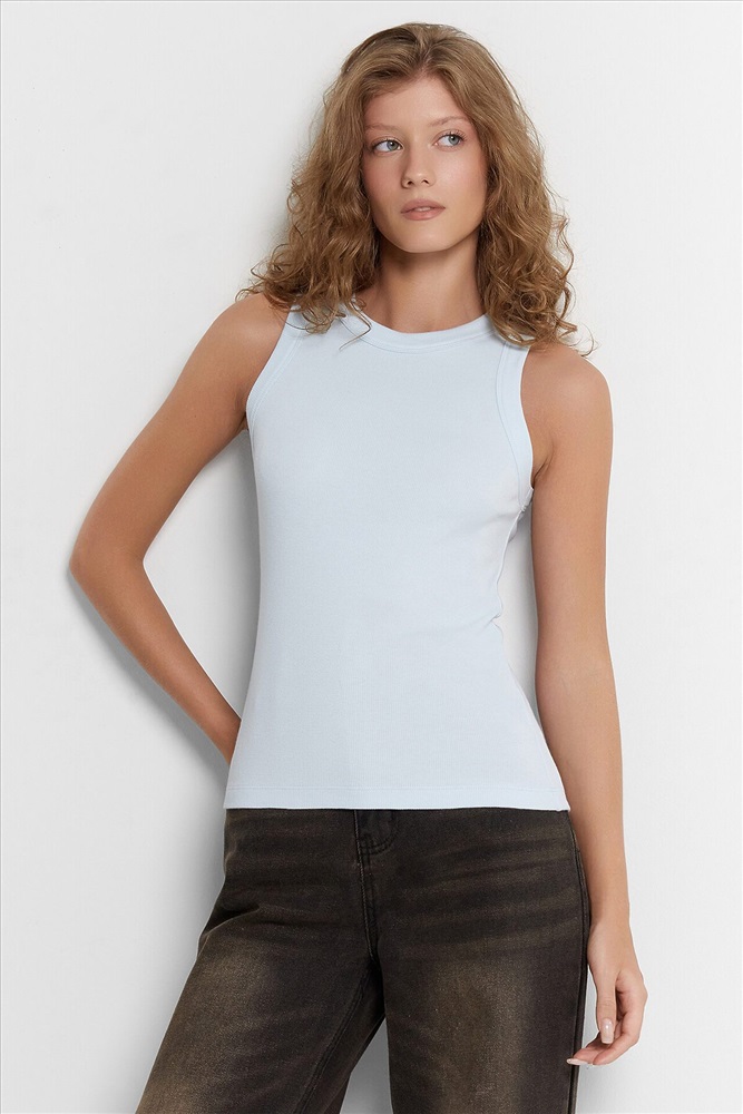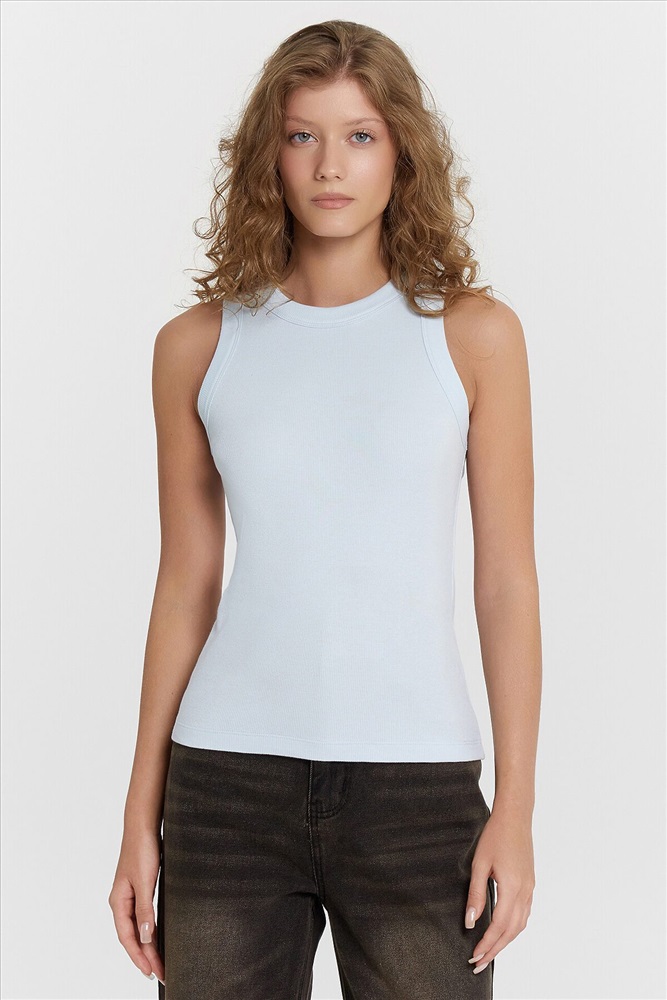 Топ женский из рибаны. Узкое плечо, углубленная пройма. Силуэт облегающий, длиной ниже уровня талии. Перед и спинка цельнокроеные. Горловина круглая, плотно прилегающая к шее. Горловина и проймы окантованы широкой бейкой из основного полотна. Низ изделия обработан швом вподгибку на плоскошовной машине.