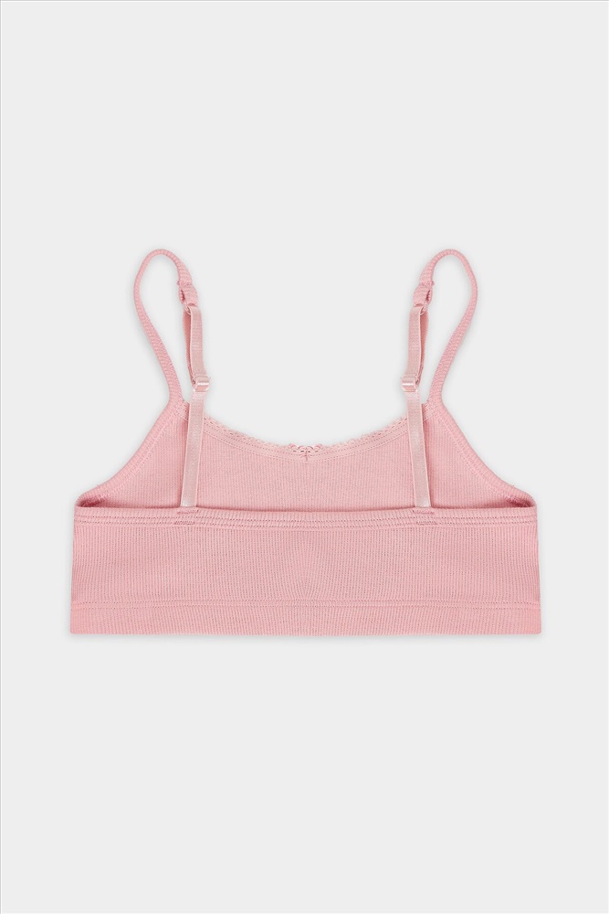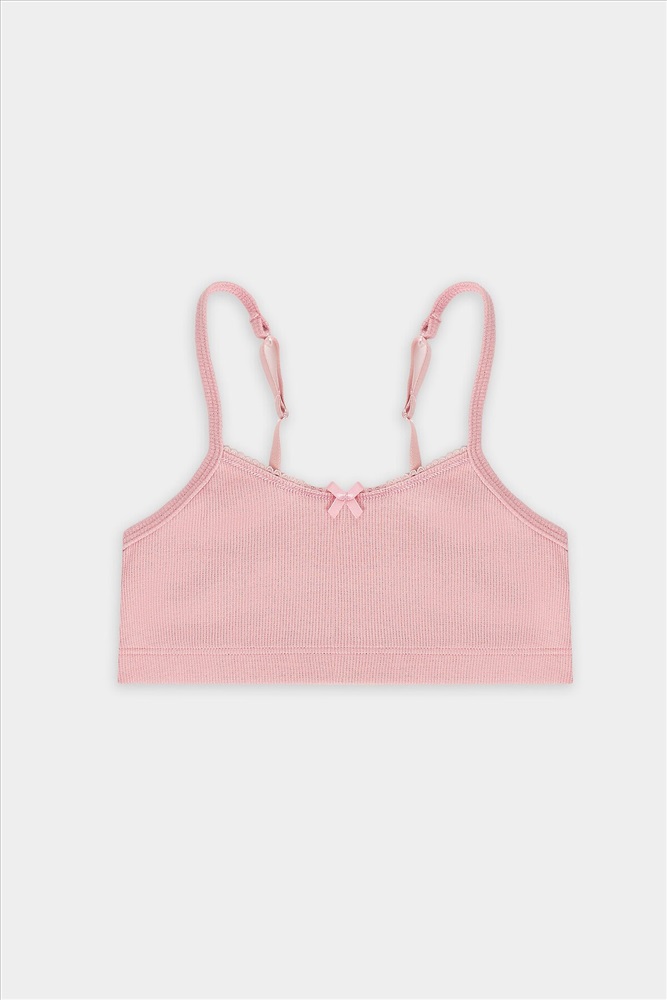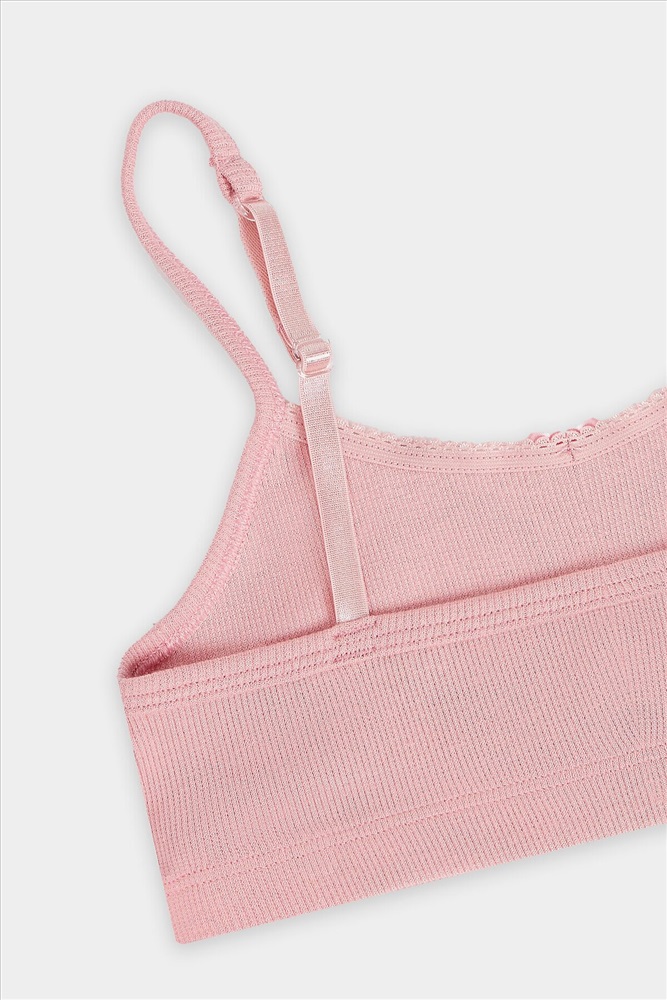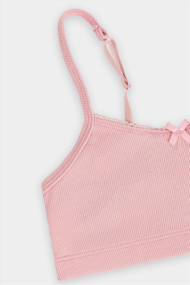 Топ прилегающего силуэта, полочка и спинка цельнокроеные. Обтачки пройм изготовлены и основного полотна, внутри эл. тесьма 6 мм (жилка WT4-6, артекс E7112). Горловина обработана эл.тесьмой 8 мм (с зубом KTE6-8, артекс E2298). По спинке обтачки соединены с бретелью 8 мм (бретель б/з SWE3-8, артекс E0001). На бретелях кольца-регуляторы (цвет никель) 8 мм. Низ топа обработан швом вподгибку с эластичной тесьмой внутри 20RV, ширина 20 мм. Бантик по заданию.