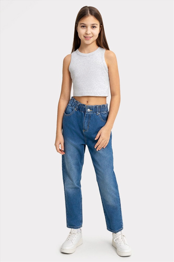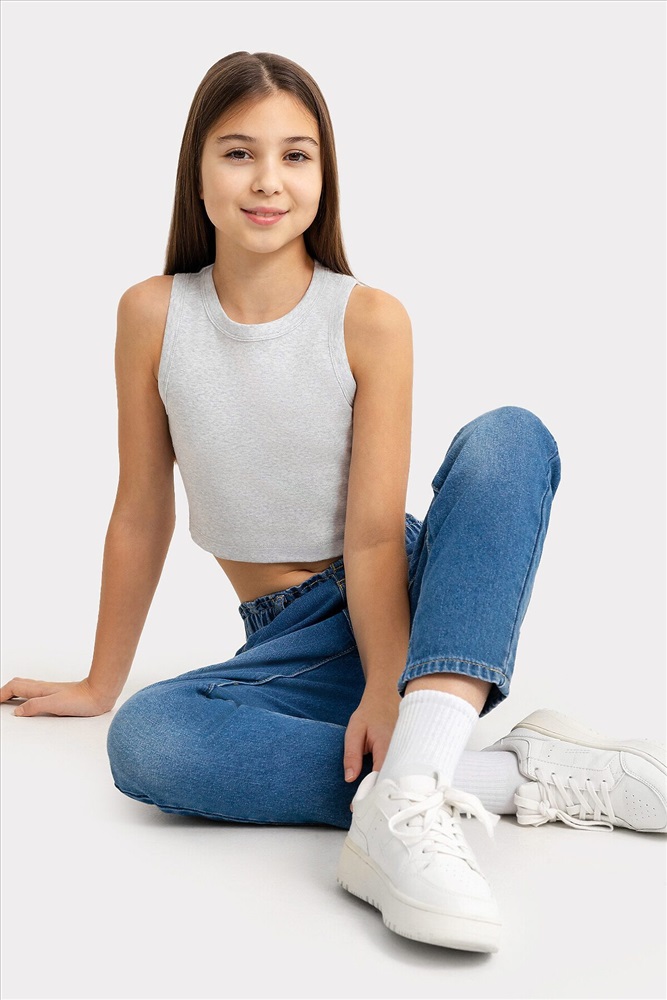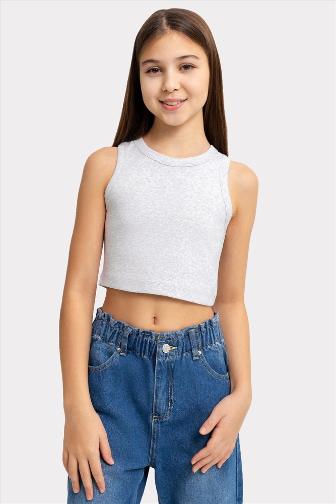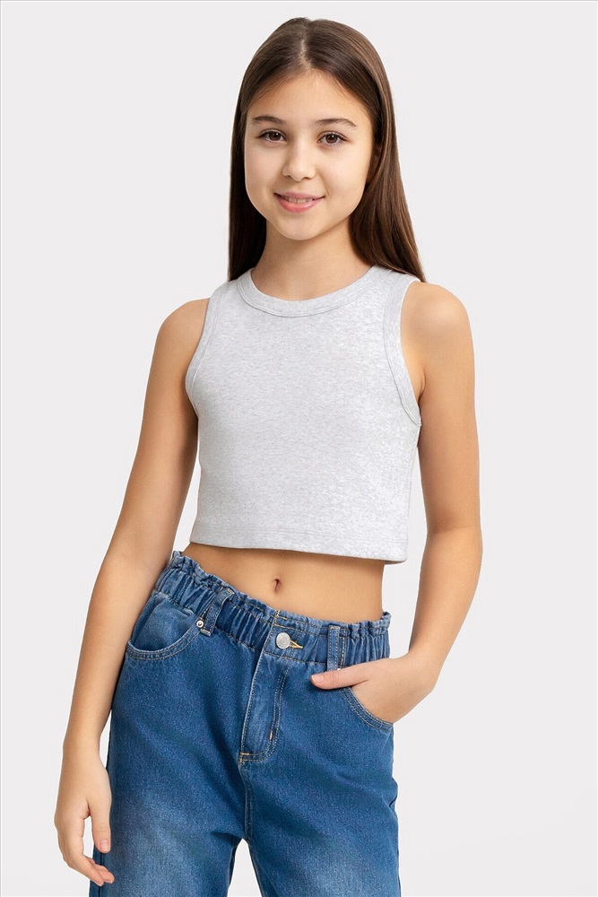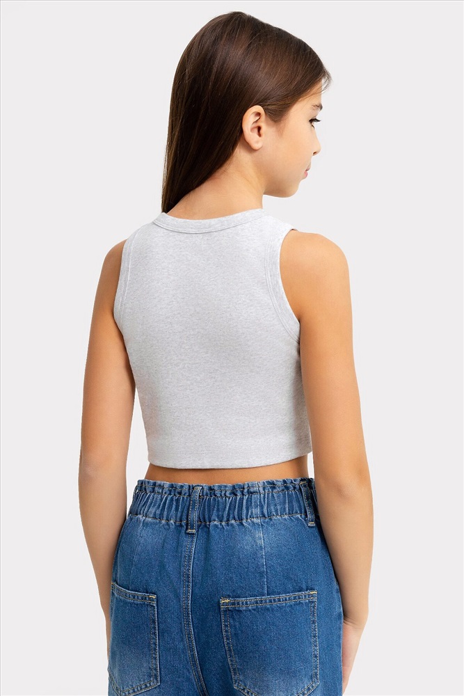 Топ для девочек прилегающего силуэта. Горловина круглая. Проймы и горловина окантованы бейкой из основного полотна. Низ изделия обработан швом в подгибку.