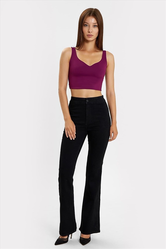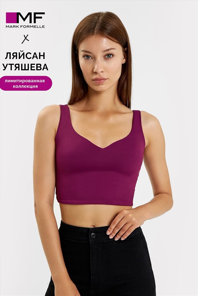 Топ женский прилегающий укороченный из эластичного полотна (выше линии талии) на подкладке. Перед и спинка цельные. Горловина переда с вырезом «сердечко», горловина спинки глубокая овальная. Срез горловины обработан подкладочной тканью в «чистый край». Бретели широкие. Проймы и низ обтачаны подкладкой. Подкладка из основного полотна.