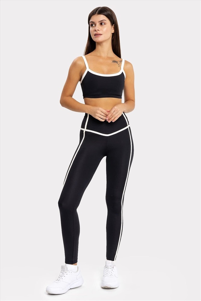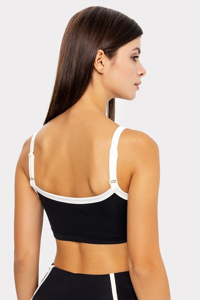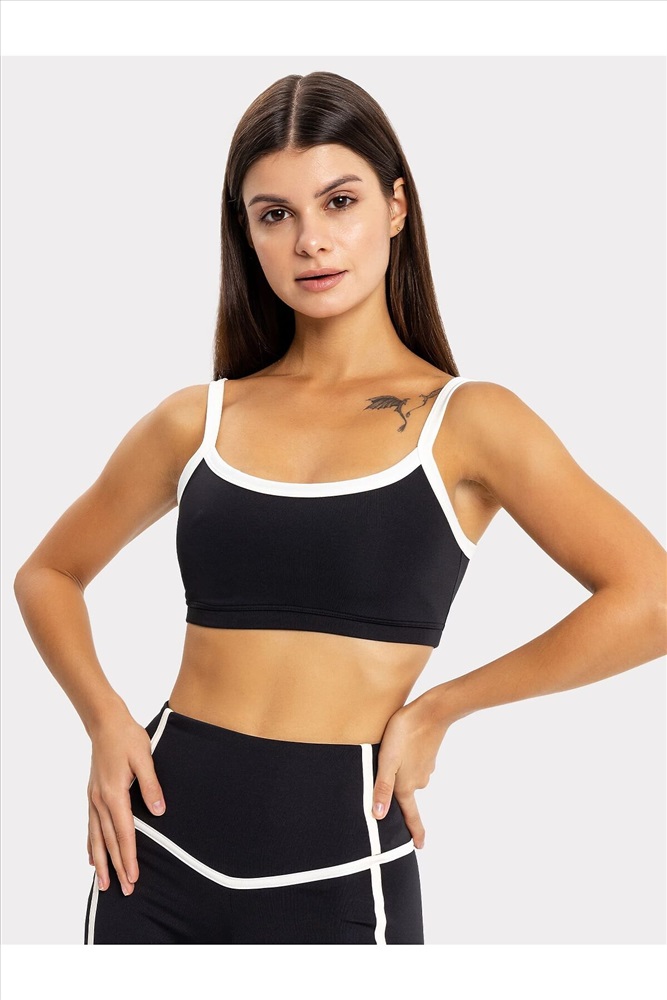 Топ изготовлен из трикотажного полотна интерлок 92%пэ, 8%эластан, 230г/м2 (INT-013.01.230). Топ облегающего силуэта, на бретелях. Бретель регулируемая по длине. Горловины и проймы окантованы бейкой из основного полотна. Деталь переда на подкладке из интерлока 90%пэ, 10%эластан, 300г/м2 (INT-053.01.300 ) Нижний срез окантован бейкой с эластичной тесьмой внутри.