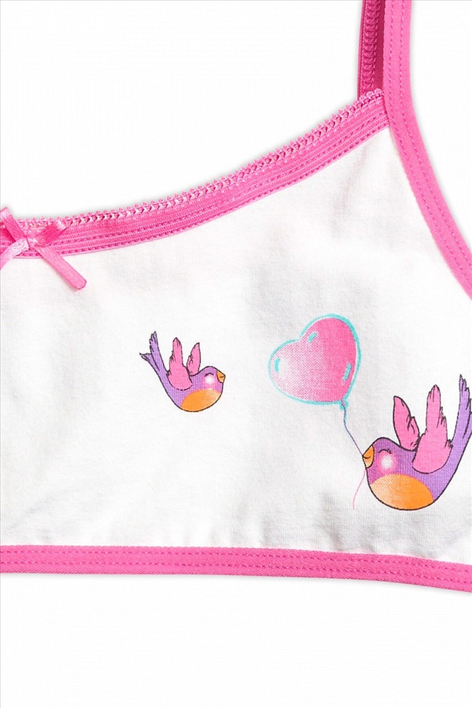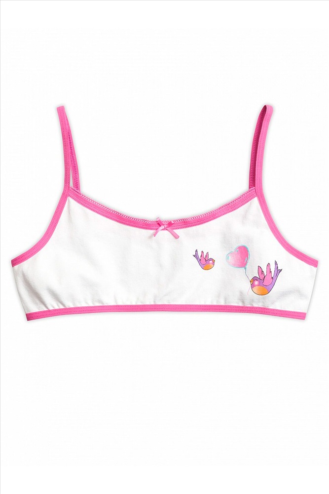 Топ для девочек на тонких бретелях из эластика. Горловина декорирована эластиком с фестонным краем и атласным бантиком. По низу изделия и проймам эластик.