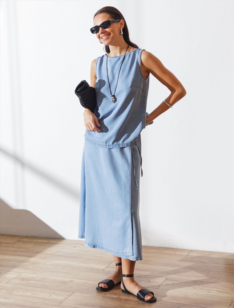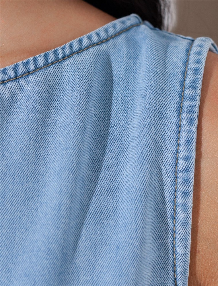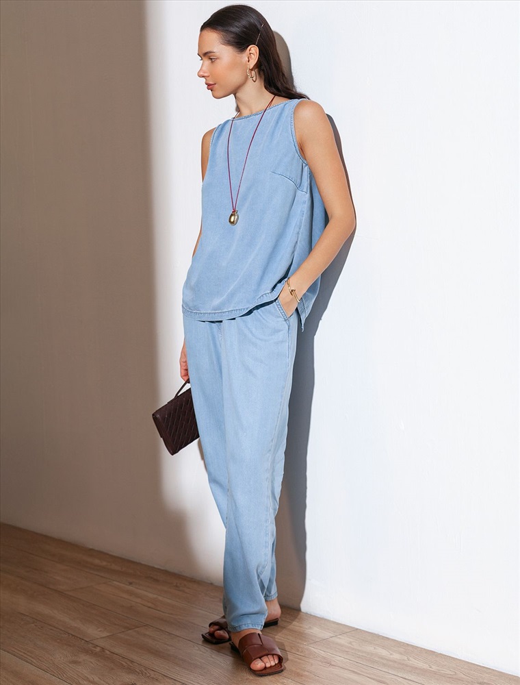 Элегантный топ без рукавов плотностью 7,8 OZ светло-голубого цвета станет идеальным выбором для теплого времени года или многослойных ансамблей. Вырез лодочка придает топу утонченность, а асимметричный разрез на спине добавляет необычности и легкой дерзости. Аккуратная контрастная вышивка на спине служит дополнительным украшением и делает изделие более уникальным. Простой прямой крой топа в сочетании с интересными деталями создает стильную и в то же время комфортную вещь. Особенность топа - состав ткани, сочетающая прочность и мягкость лиоцелла с вискозой, что делает её невероятно комфортной, дышащей, устойчивой к сминанию и идеально подходящей для чувствительной кожи. Благодаря нежным тактильтным ощущениям, будто шелк, от которого ощущается приятная прохлада, повседневный топ подойдет на жаркое лето. Топ подойдет для любительниц базовой одежды, которые хотят деликатно повысить градус своего стиля.
