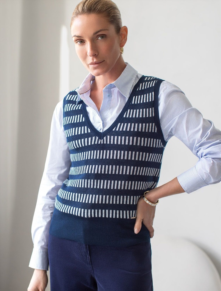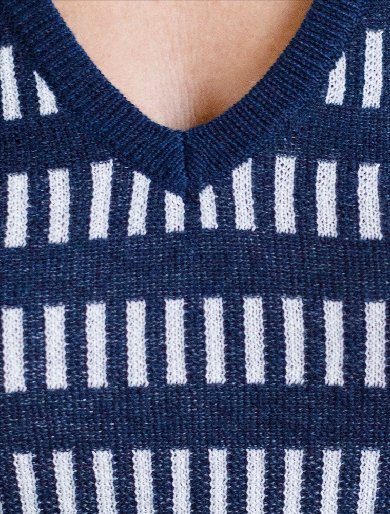 Топ из тонкого жаккарда выполнен из вискозы. Вертикальный вывязанный принт визуально стройнит и вытягивает силуэт. Добавление в состав ПЭ способствует легкости и износостойкости изделия. Мягкая пряжа приятно ощущается на теле и дарит настоящий комфорт в теплое время года. Можно стилизовать изделие в многослойных образах как жилет.