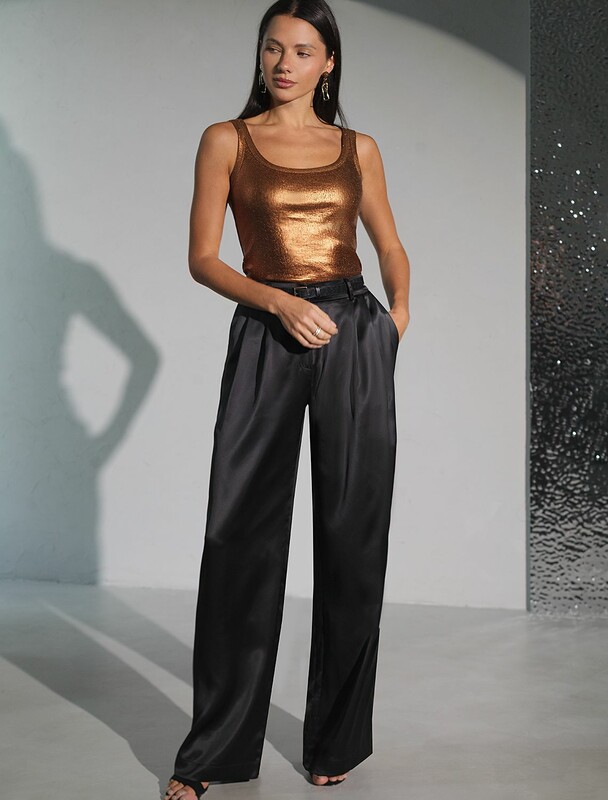 Эффектный топ черного цвета с широкими лямками — идеальный выбор для создания стильного образа на каждый день или вечерний выход. Ткань в мелкий рубчик визуально вытягивает силуэт, правильный крой подходит на любую фигуру, комфортно садится на большие размеры, не сковывая движений. Изысканный матовый блеск металлик добавляет современный акцент даже самому простому образу.