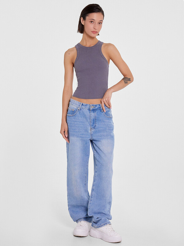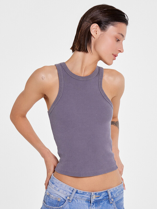 Нижний срез топа обработан швом вподгибку на 2х иглольной плоскошовной машине.
