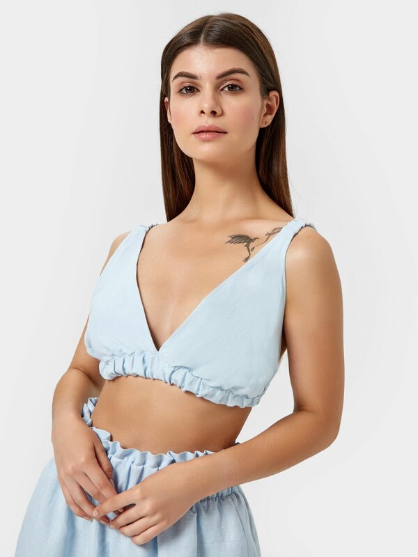 Топ с треугольными чашками, на бретелях. Бретели с втаченой внутрь эластичной тесьмой, присборены. Низ изделия обработан поясом с втаченной эластичной тесьмой.