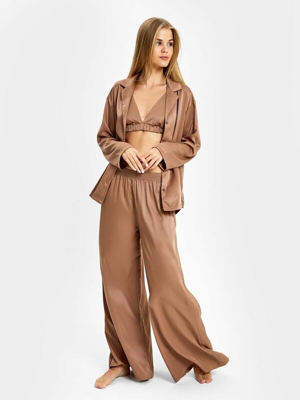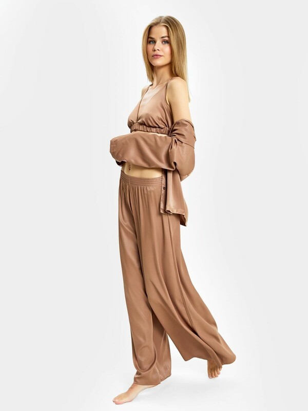 Топ с треугольными чашками, на бретелях. Бретели с втаченой внутрь эластичной тесьмой, присборены. Низ изделия обработан поясом с втаченной эластичной тесьмой.