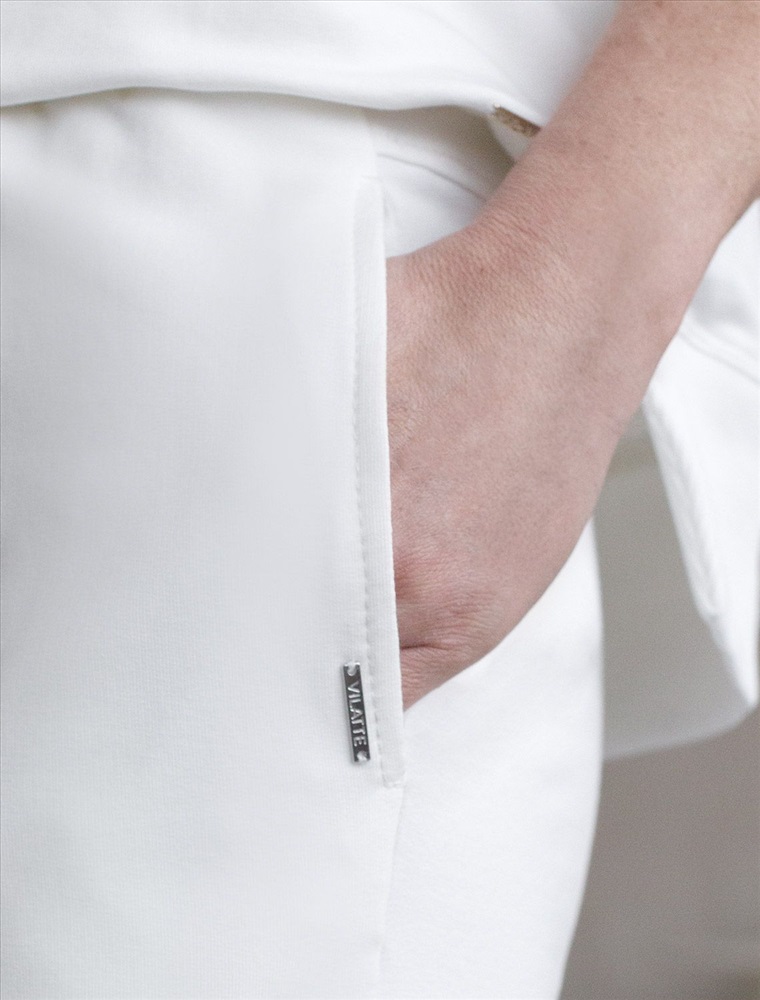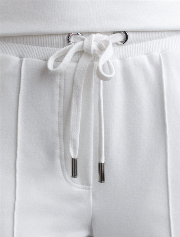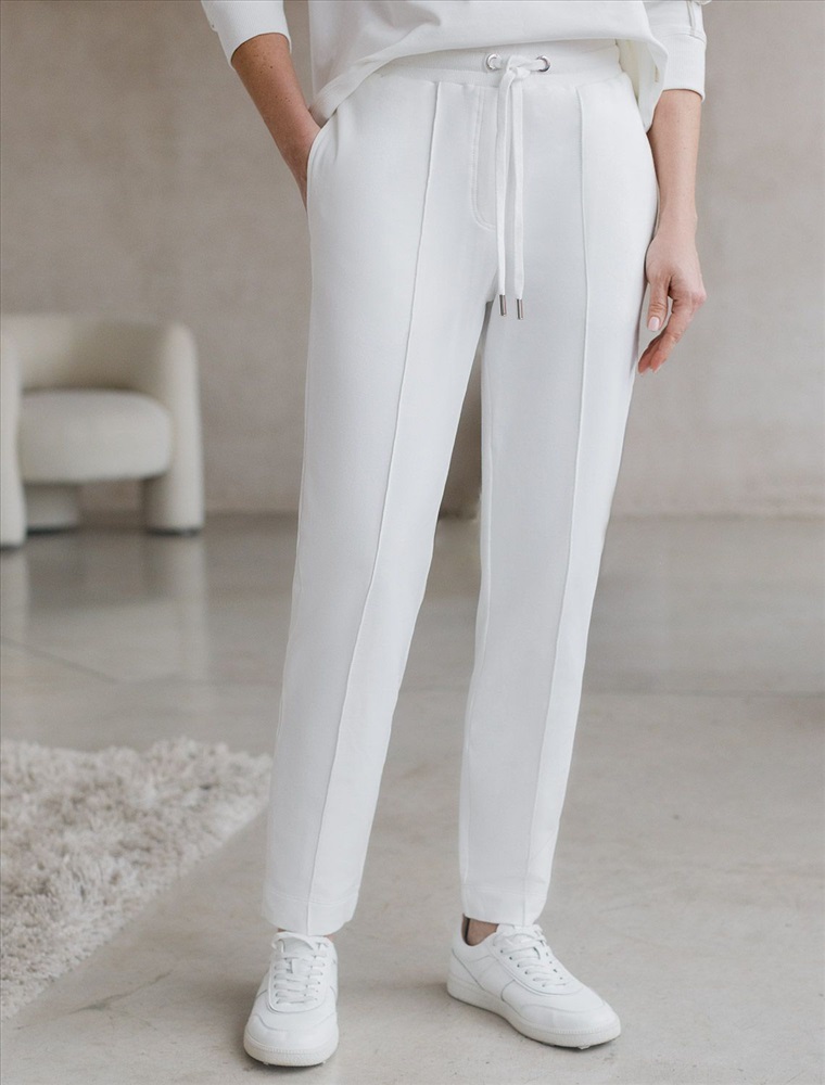 Брюки белого цвета зауженного кроя выполнены из премиального футера-двухнитки. Лаконичный силуэт поддерживают застроченные стрелки, зрительно вытягивающие силуэт. Удобный пояс на резинке регулируется хлопковым шнурком с серебристой фурнитурой. Наличие эластана в составе изделия гарантирует комфорт и долговечность изделия. Эластичный материал хорошо пропускает воздух, позволяя телу дышать, и легко тянется, не ограничивая движения.