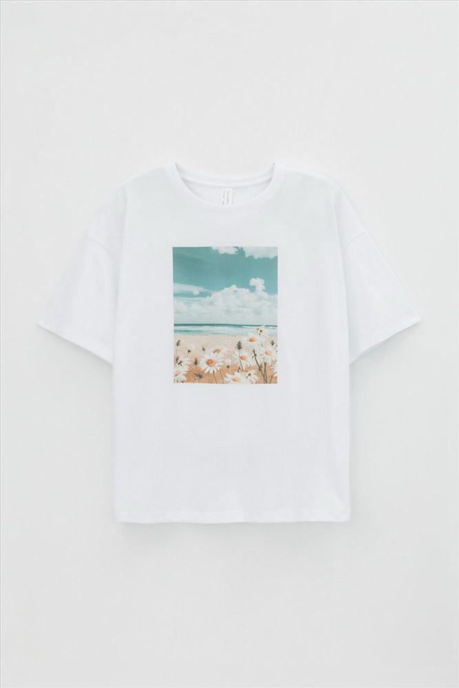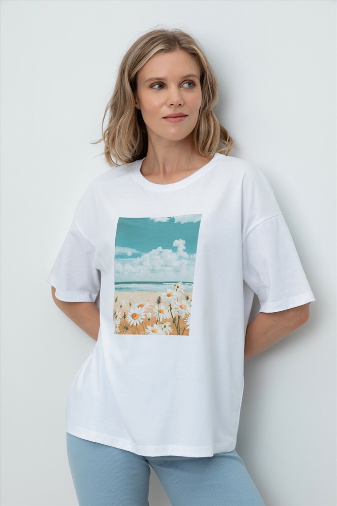 Удлиненная футболка из 100% натурального хлопка. Свободные рукава со спущенной линией плеча создают объём и свободный силуэт. Принт изготовлен из стойких текстильных красителей.