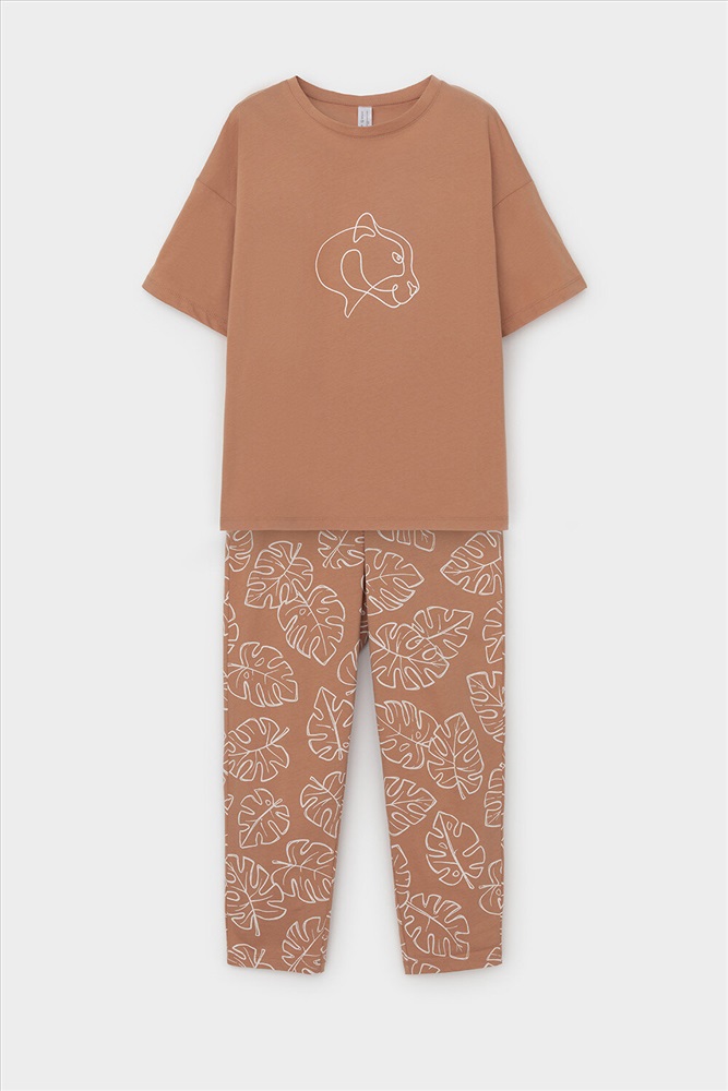 Легкий комплект для комфортного сна и отдыха. Свободная футболка с принтом и спущенной линией плеча комфортно садится по фигуре. Укороченные брюки с удобными боковыми карманами выполнены из набивного трикотажа. Гладкий материал приятен к телу и позволяет коже дышать.