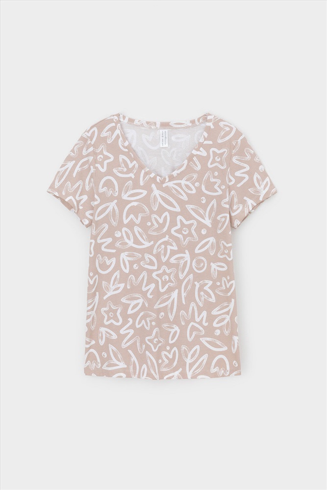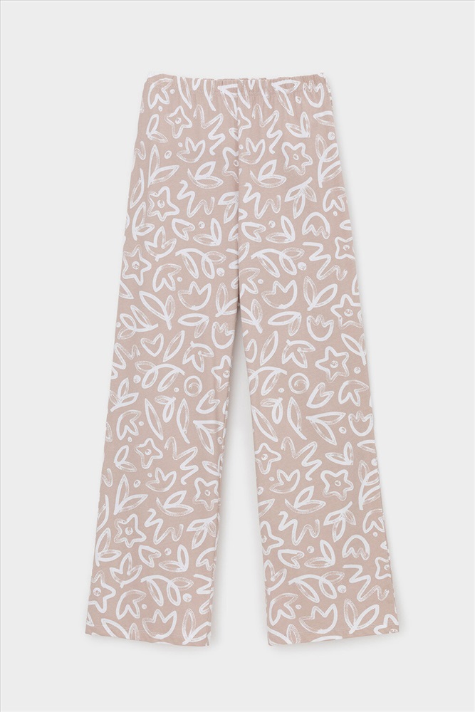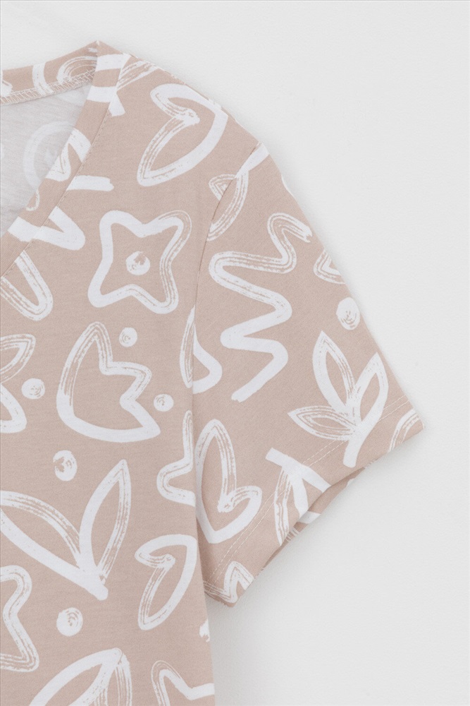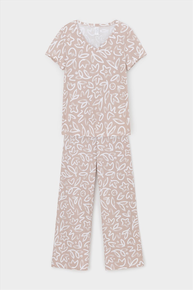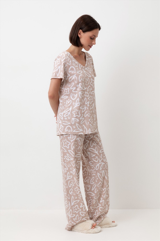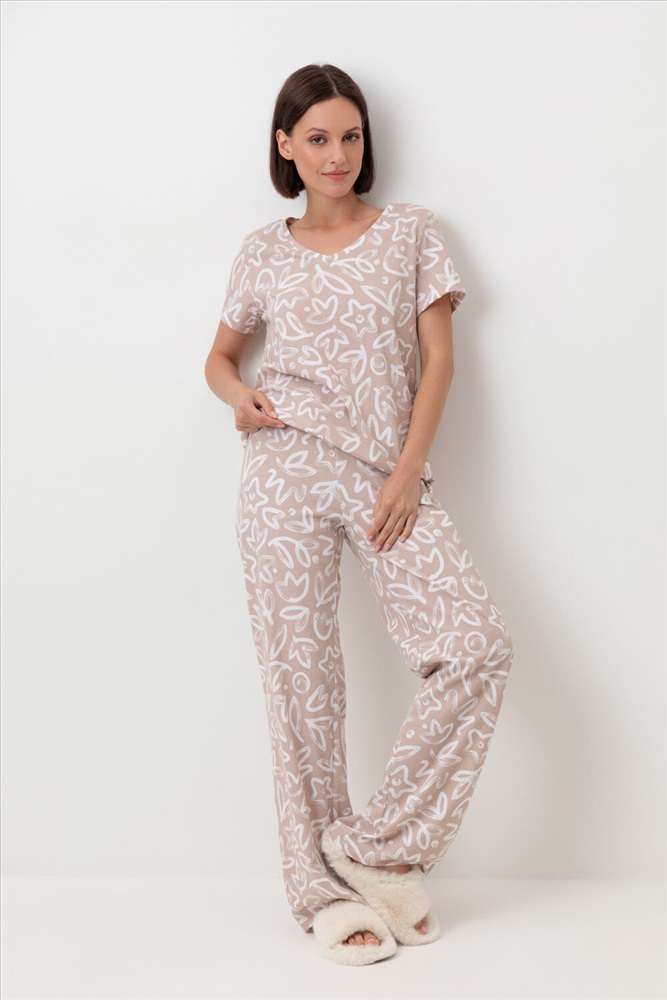 Легкий комплект для комфортного сна и отдыха из натурального хлопка. Футболка с V-образным вырезом комфортно садится по фигуре. Брюки с поясом на резинке выполнены из набивного трикотажа. Гладкий материал приятен к телу и позволяет коже дышать.