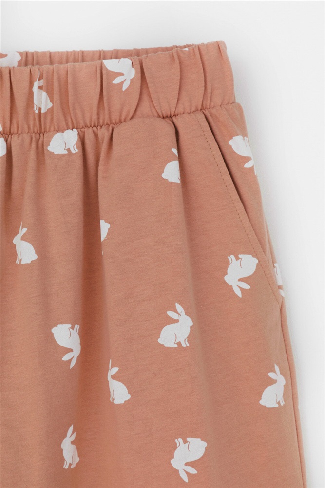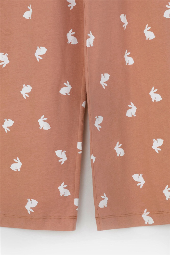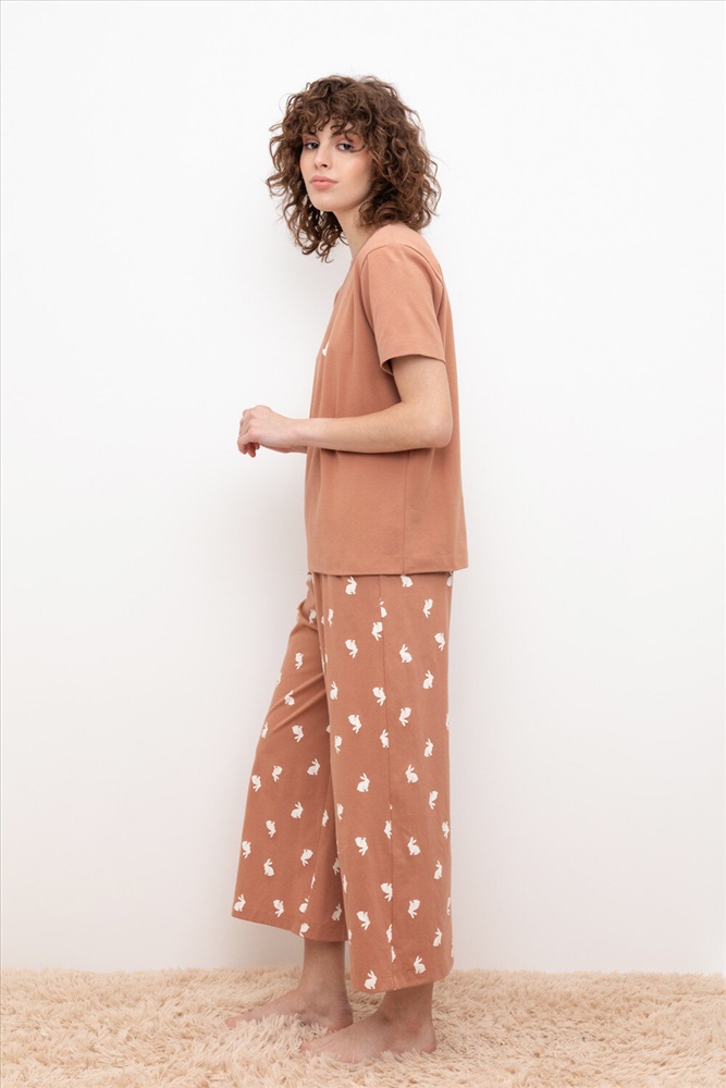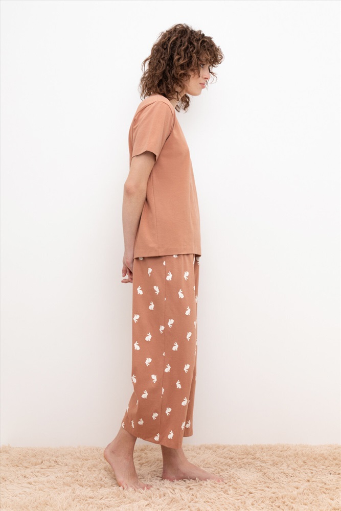 Комплект для сна и отдыха из натурального хлопка с добавлением лайкры. Футболка стандартной длины с принтомкомфортно садится по фигуре. Укороченные просторные брюки с карманами из набивного трикотажа с мягким поясом на резинке.