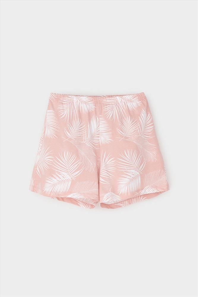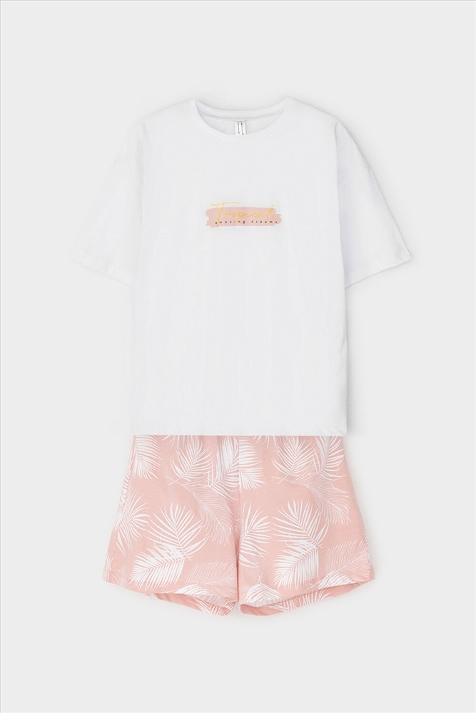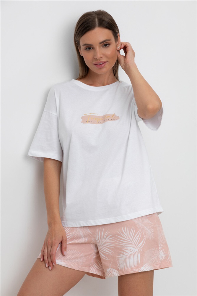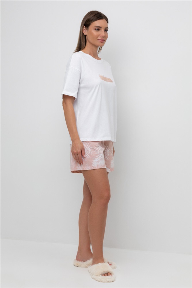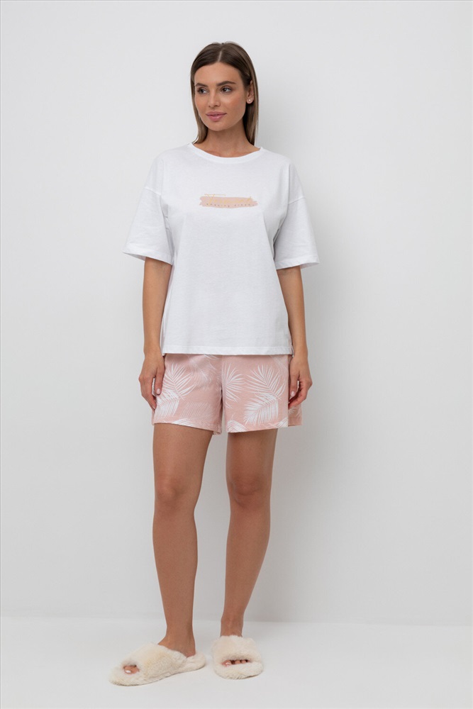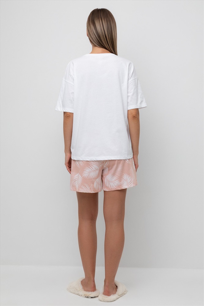 Комплект для комфортного сна и отдыха из трикотажа с нежным рисунком из 100% натурального хлопка. Футболка с короткими рукавами и спущенной линией плеча комфортно садится по фигуре. Шорты с мягким поясом на резинке. В поясе шорт атласная лента. Свободный силуэт не сковывает движения.