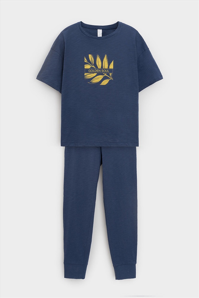 Легкий комплект для комфортного сна и отдыха из меланжевого трикотажа. Футболка с принтом и спущенной линией плеча комфортно садится по фигуре. Брюки с эластичными манжетами с боковыми карманами. Круглый шнур позволяет регулировать посадку. Гладкий материал приятен к телу и позволяет коже дышать.