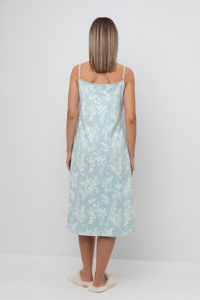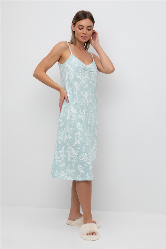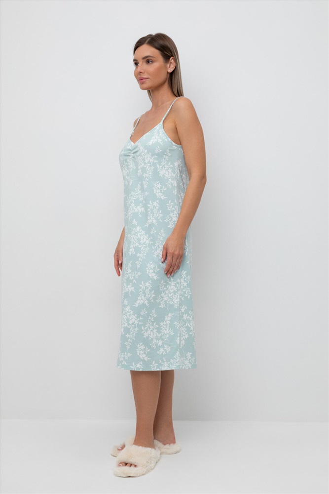 Элегантная женская сорочка с регулируемыми бретелями для комфортного сна. На груди декоративная сборка. Гладкий материал приятен к телу и позволяет коже дышать.