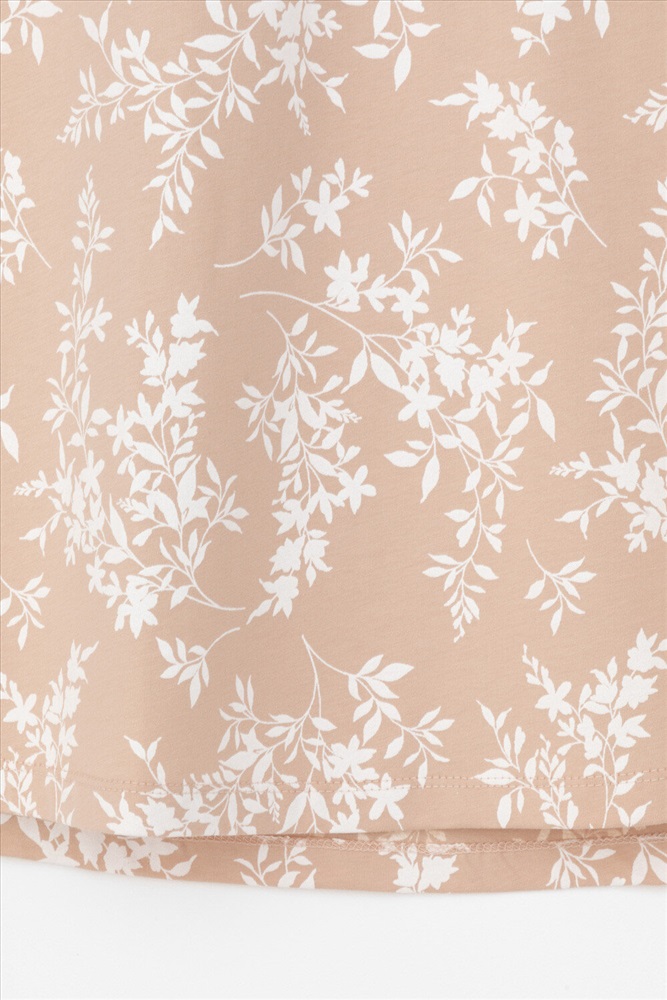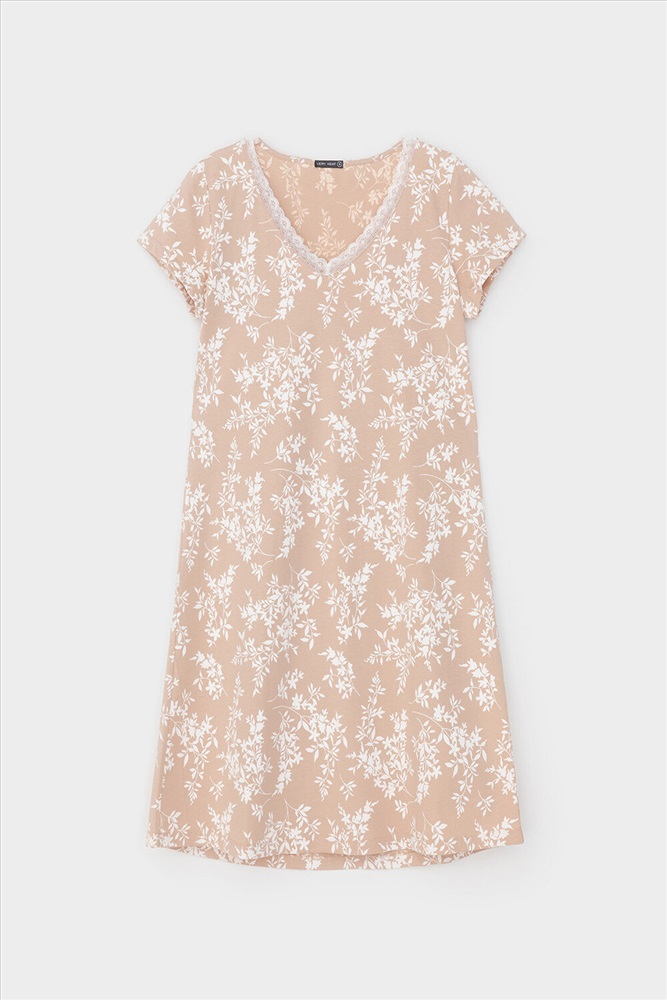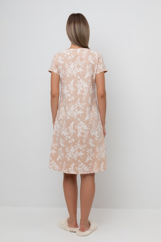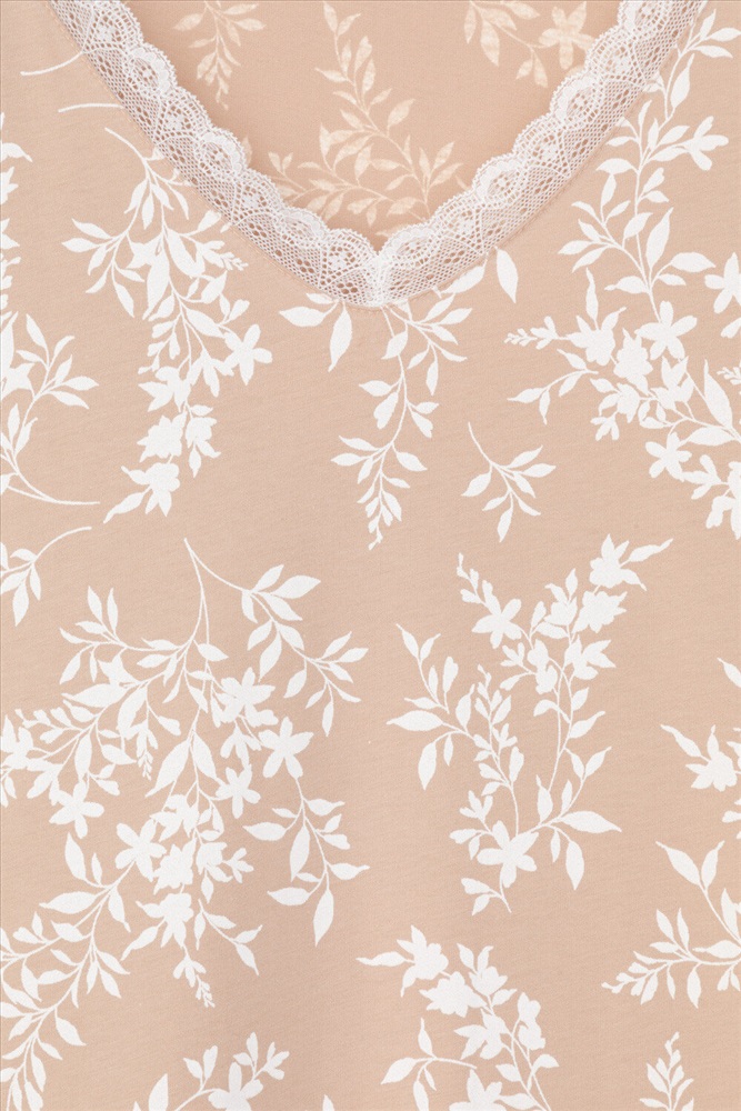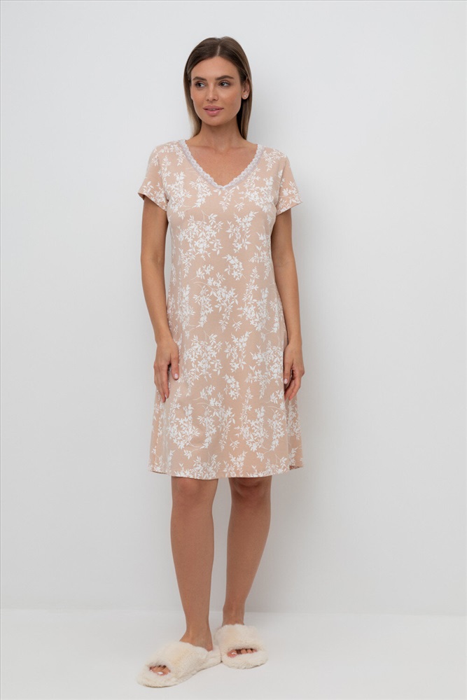 Уютная удлиненная сорочка с короткими рукавами из 100% натурального хлопка. Горловина украшена эластичным кружевом. Выполнена из набивного трикотажа супрем с нежным рисунком.