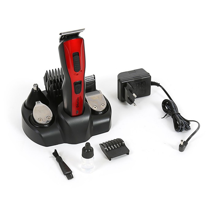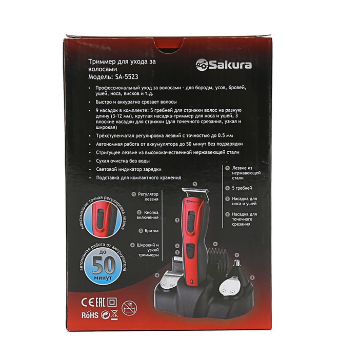 Производитель: SAKURA Габариты: 19,5 x 13,5 x 9 Страна: Китай В боксе: 12 шт Состав: Металл, пластик Материалы: металл, пластик Фасовка: по 1 шт Индивидуальная упаковка: Цветная коробка Сертификат: ЕАС Тип питания: От аккумулятора Цвет: Красный Для кого: Унисекс Время заряда аккумулятора, мин: 8 Количество насадок: 10 Гарантийный срок, мес.: 12 Время автономной работы, мин: 50 Материал лезвия: Сталь Область применения: Для носа и ушей, Для бороды и усов Способ чистки: Можно мыть лезвия Комплектация: Подставка, Блок питания, Масло, Машинка для стрижки, Щёточка для чистки лезвий, Насадки