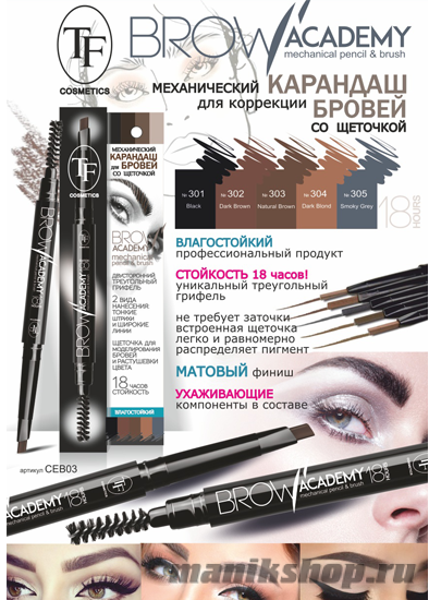 Триумф tf Карандаш механический со щеточкой для бровей Brow academy 304 темный блонд в упаковке 07519