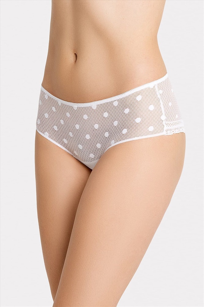 Трусы женские, средняя линия талии, шорты. Передняя деталь выполнена из кружевного полотна. Задние детали выполнены из кружева. Подкладка ластовицы из хлопка, отлетная по верхнему срезу. Верхний срез обработан тесьмой с зубом. Нижние срезы передней детали обработаны жилкой.