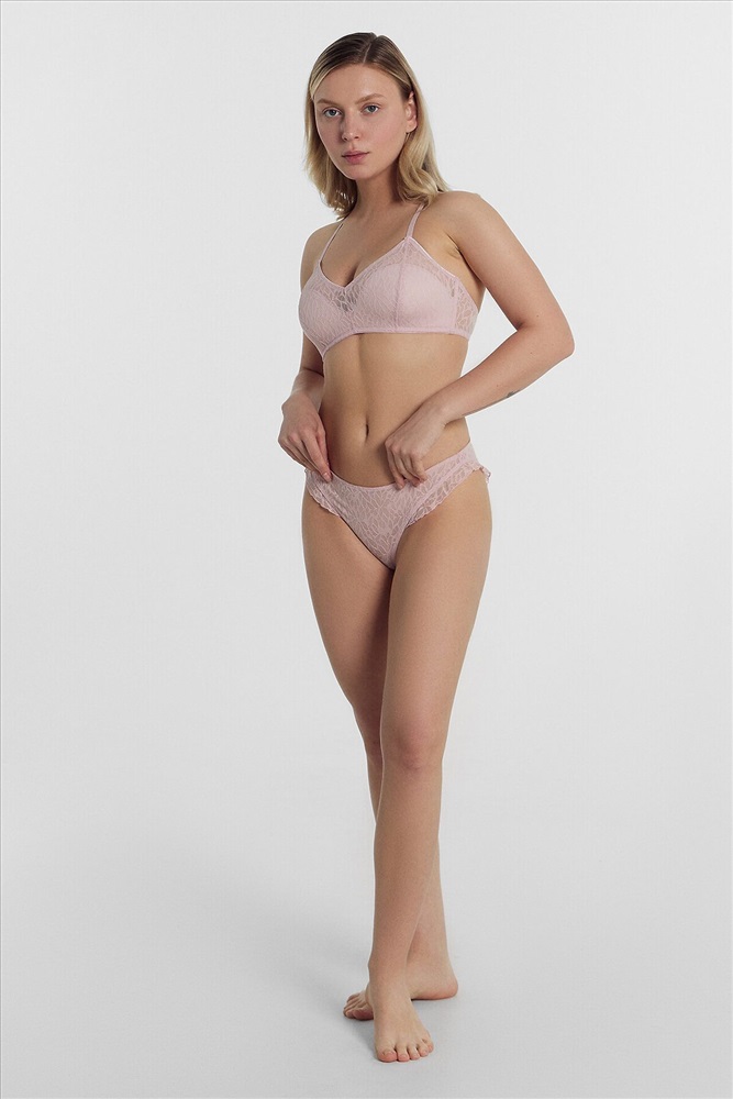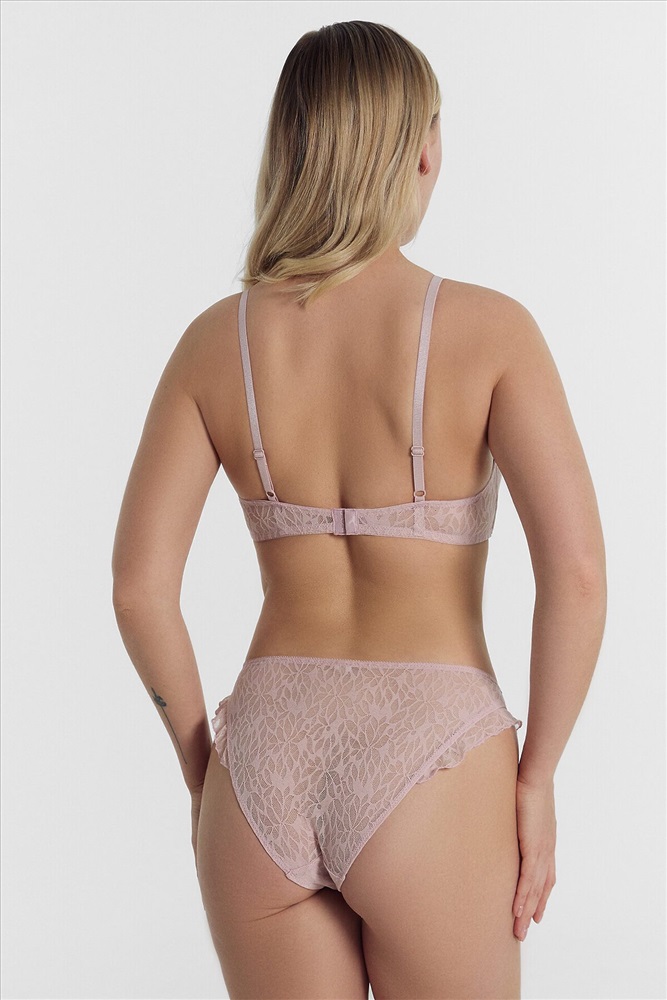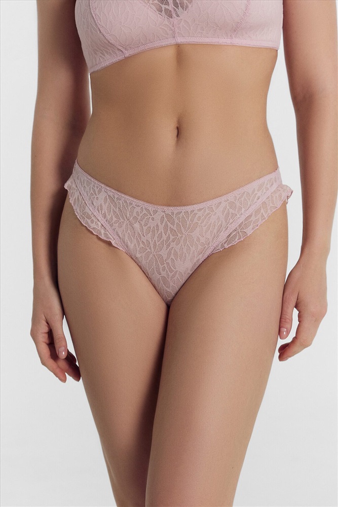 Трусы женские, средняя линия талии, слипы. Передняя и задняя детали выполнены из кружевного полотна. Рюша из кружевного полотна. Подкладка ластовицы из хлопка, отлетная по верхнему срезу. Верхний срез обработан тесьмой с зубом. Нижние срезы обработаны жилкой 6мм. Край рюши обработан закруткой.