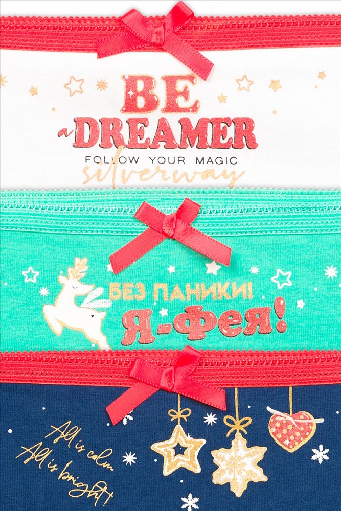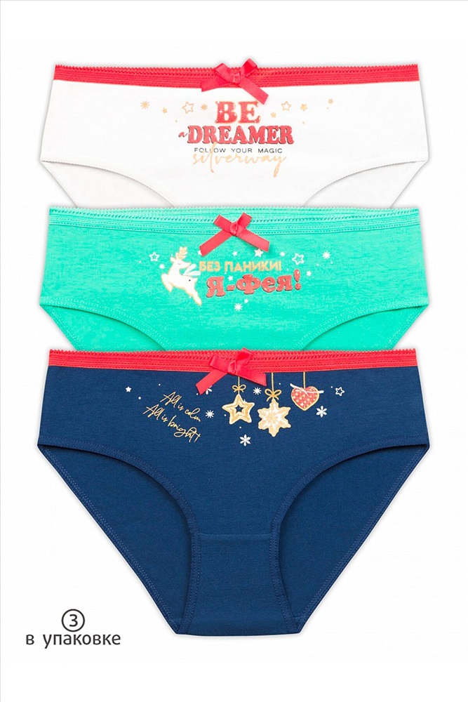 Трусики слипы со средней посадкой для девочек. В комплекте 3 изделия. По талии эластик с фестонным краем, декор в виде атласного бантика. Прочный принт с золотом и разноцветным глиттером. Обработка эластиком по ноге.