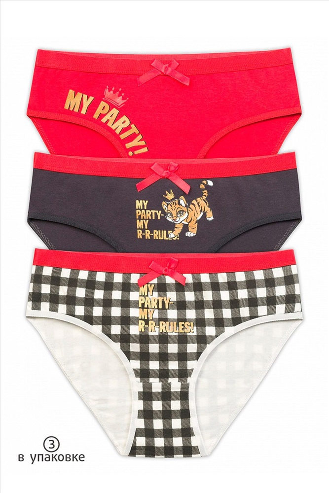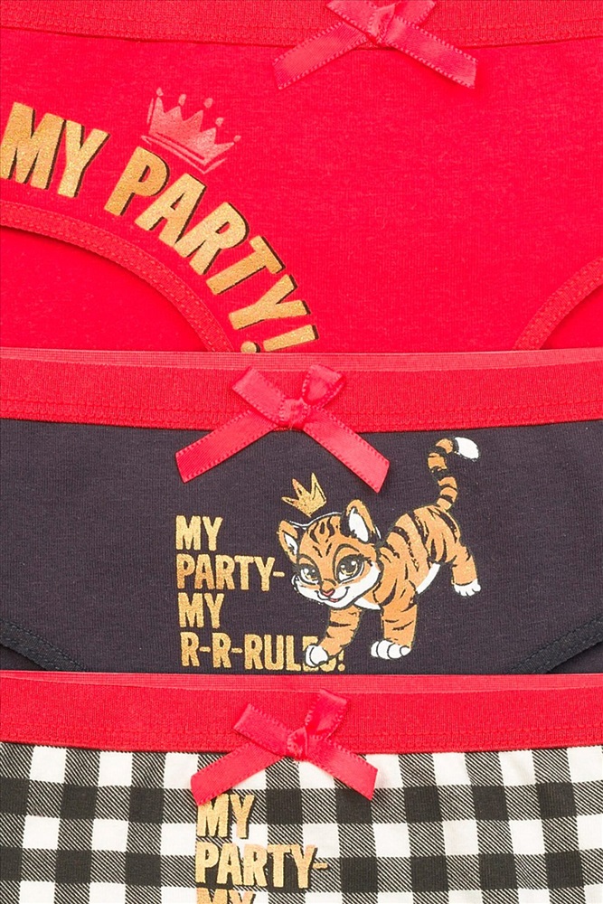 Трусики слипы со средней посадкой для девочек. В комплекте 3 изделия. По талии широкий эластик с сатиновым блеском, декор в виде атласного бантика. Прочный принт с золотом. Обработка эластиком по ноге.