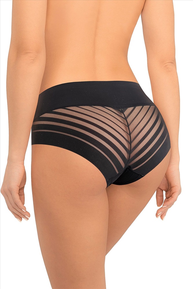 Трусы макси-слип с высокой линией талии. Передняя деталь выполнена из мягкой микрофибры, задняя деталь - из декоративного полотна с чередующимися полосками разной ширины. Спереди вырез ножки обработан с использованием технологии "лазерный край". Линия талии проклеена вподгибку. Хлопковая ластовица притачана к изделию потайным швом. Благодаря особенностям обработки материалов изделие абсолютно незаметно под одеждой. 1 штука в упаковке, упаковка - адресная картонная коробочка.
